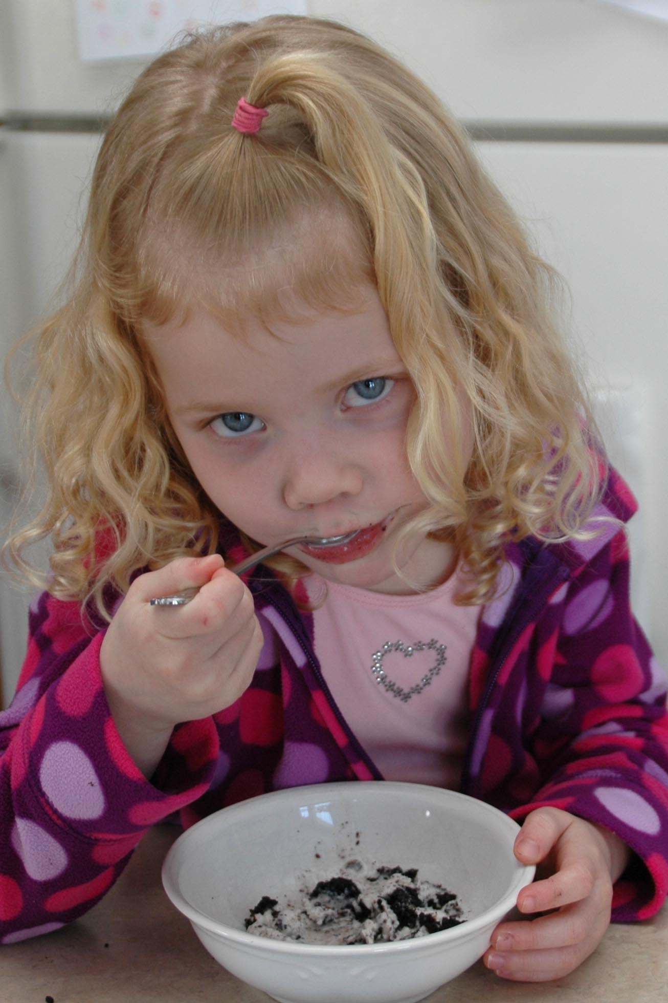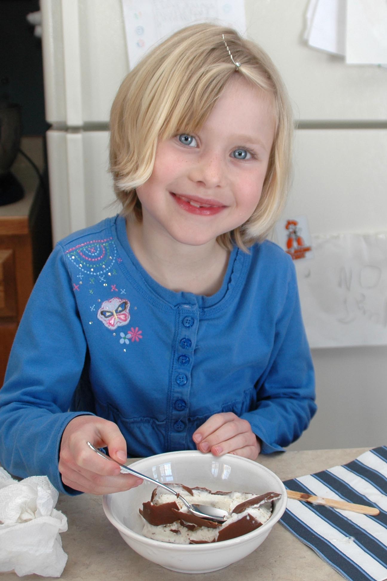 Likewise, Laurel needed a bowl and spoon for hers because she was eating slowly and her hand was getting tired of holding the stick. Evidently, ice cream weighs more than the popsicles they are used to eating.