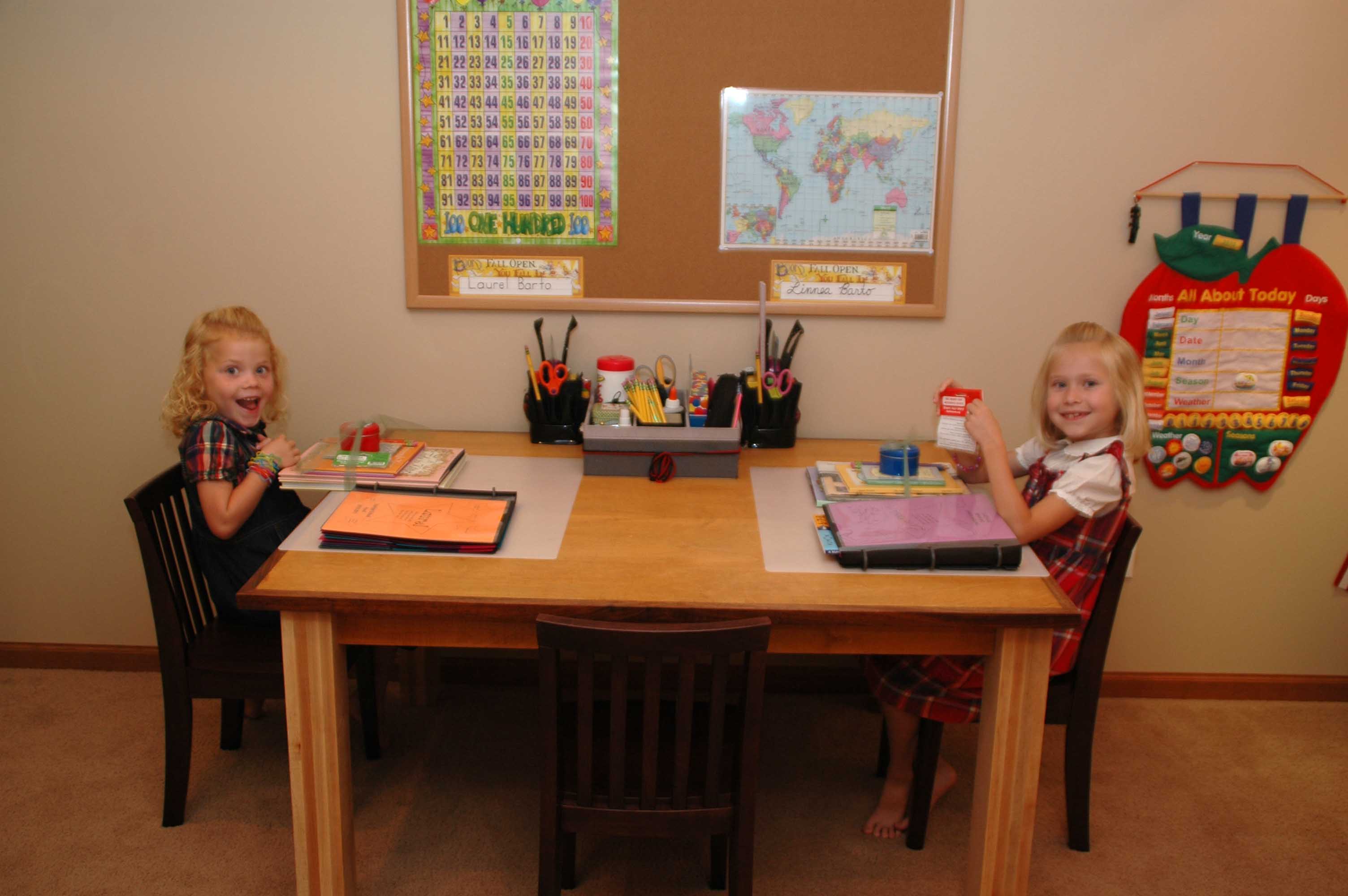We — and by that I mean my husband — shortened the school table and purchased new chairs for all three of us. I could not be happier sitting in any other chair. Yes indeed, I am sitting in a child-sized chair. But it is from Pottery Barn, and it fits me better than our dining room chairs, thank-you-very-much. I also booted two little desks out of the room entirely, which frees up a lot of space and makes the entire room more pleasant to occupy.