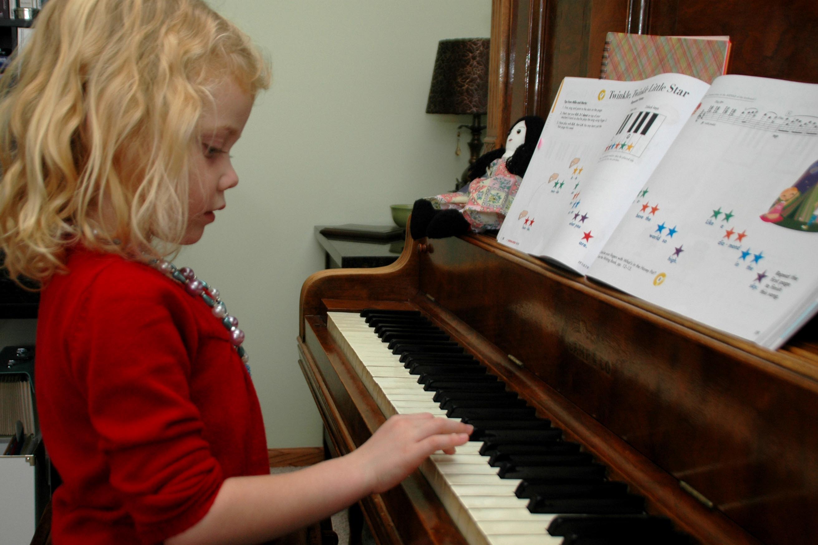 Above is Laurel, age 5, twinkling at the piano, sometime in December. “Twinkle, Twinkle Little Star” is the first song she has learned to play since her “pre-reading” piano lessons began one wonderful week in late October with Miss Amanda.