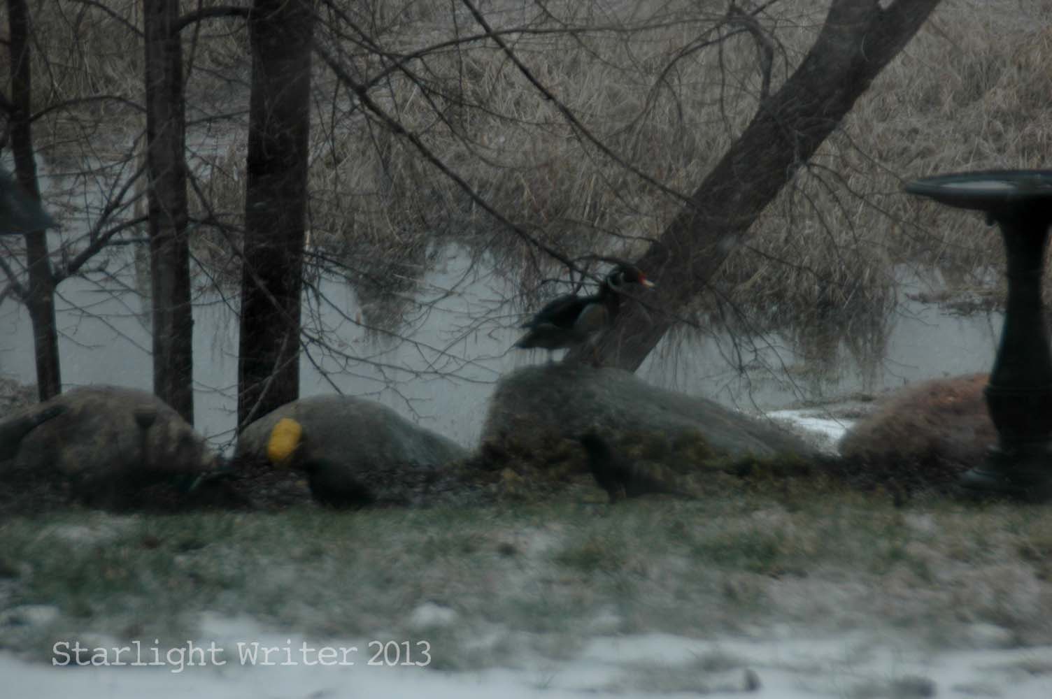 One snowy afternoon a pair of wood ducks came as close as the rocks below our bird feeders. That’s just a few feet from the edge of the patio!