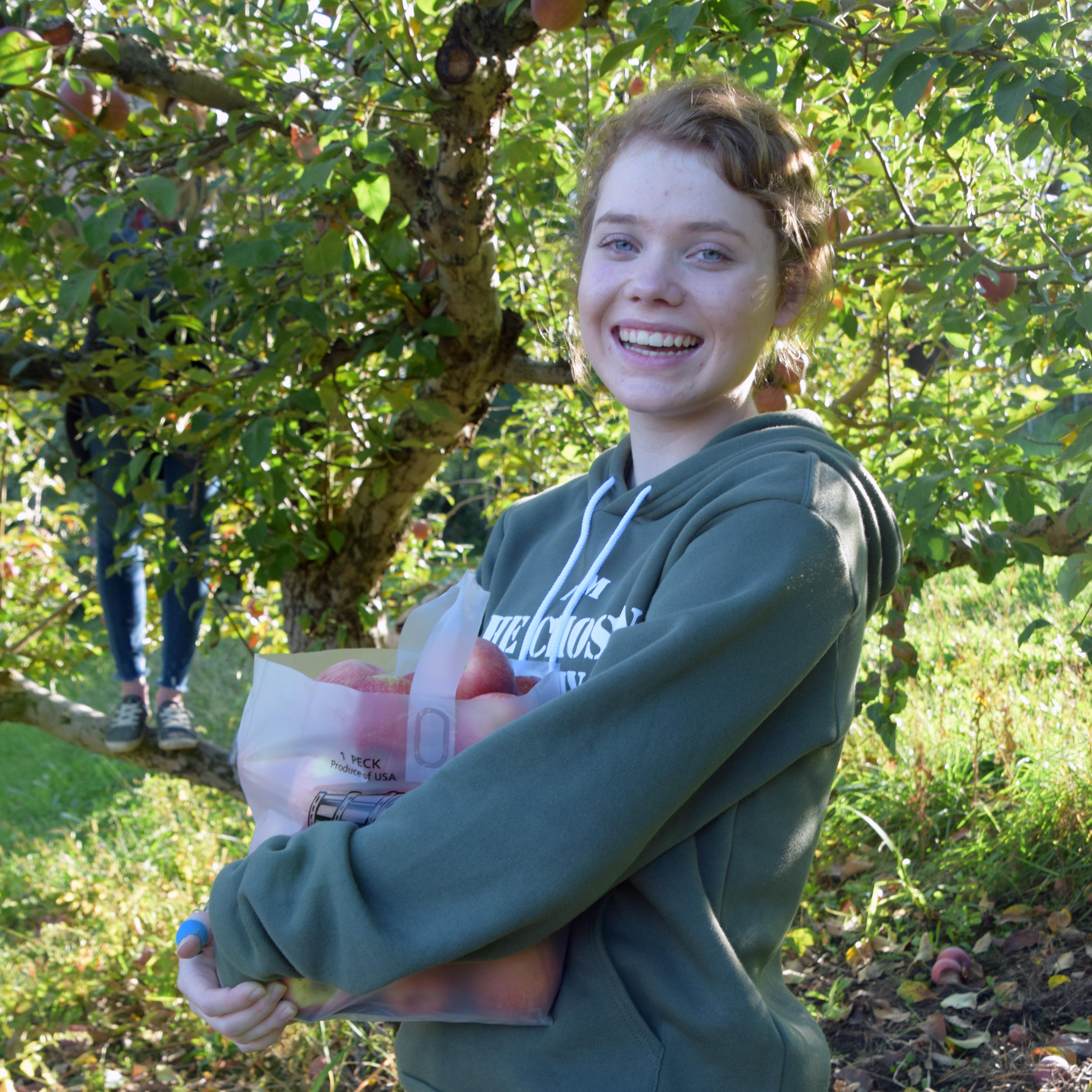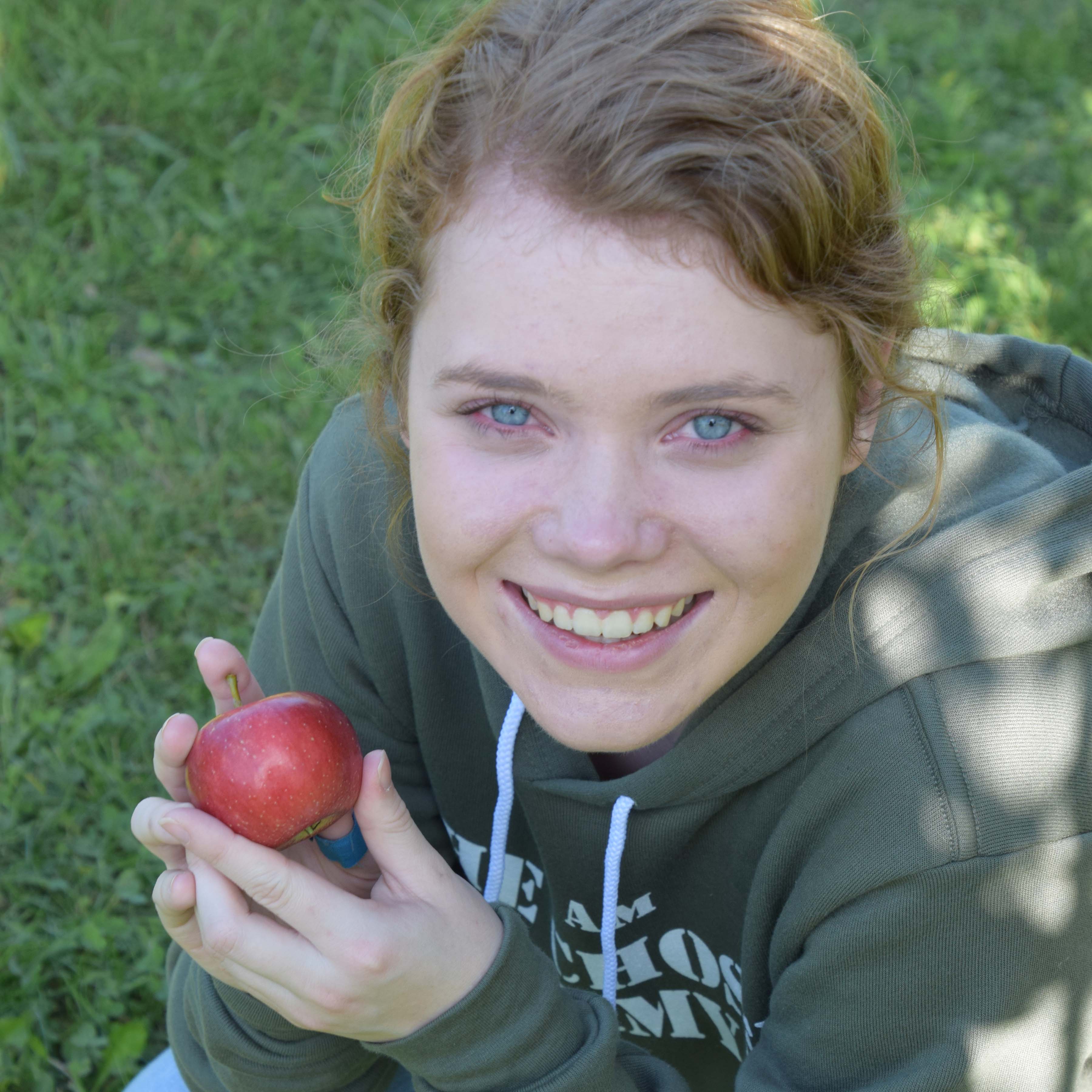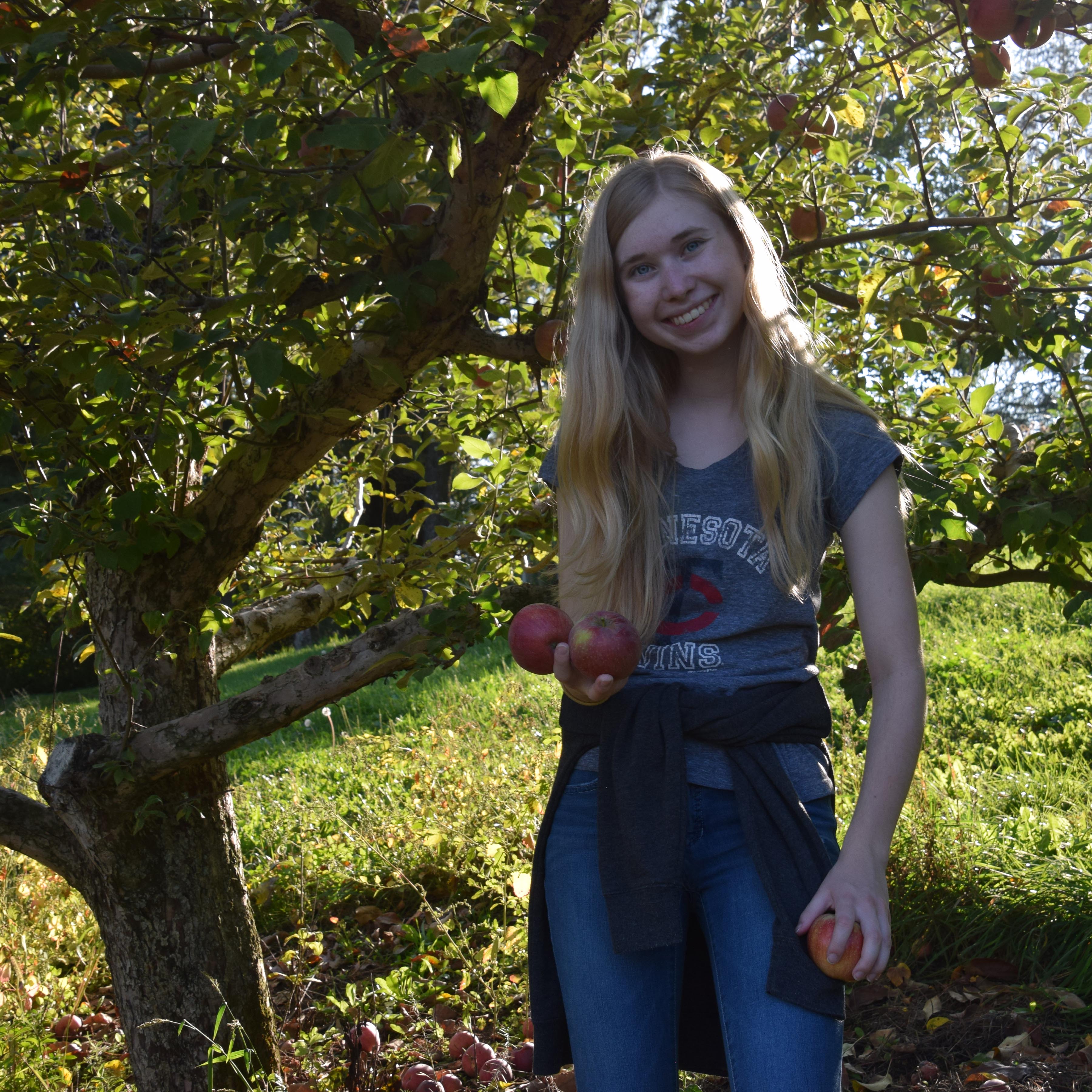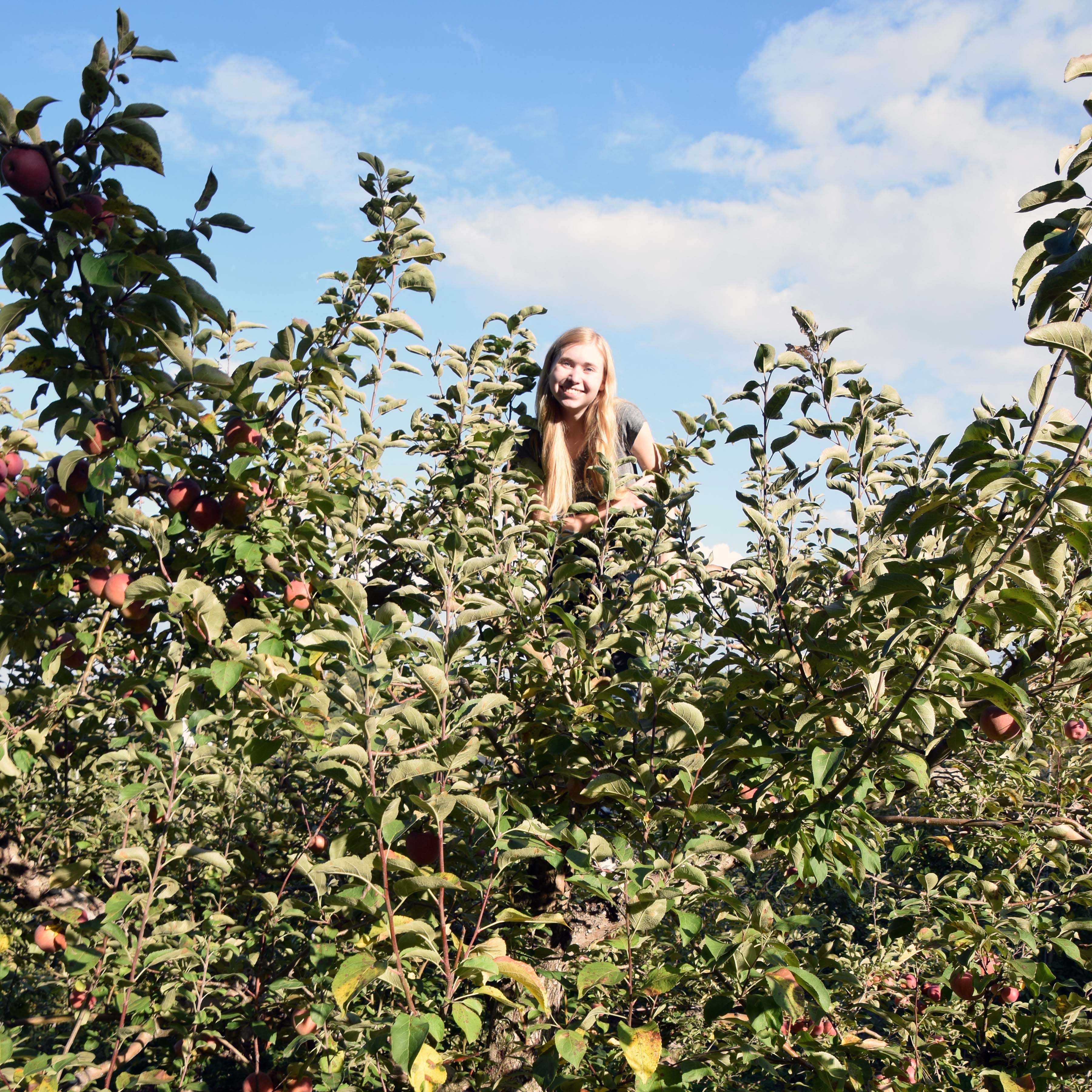 Eventually we found the Sweet 16 apples in a far-off row in the back of the orchard. They were a little past their prime, so our soon-to-be-sweet-16 just picked one to pose with.