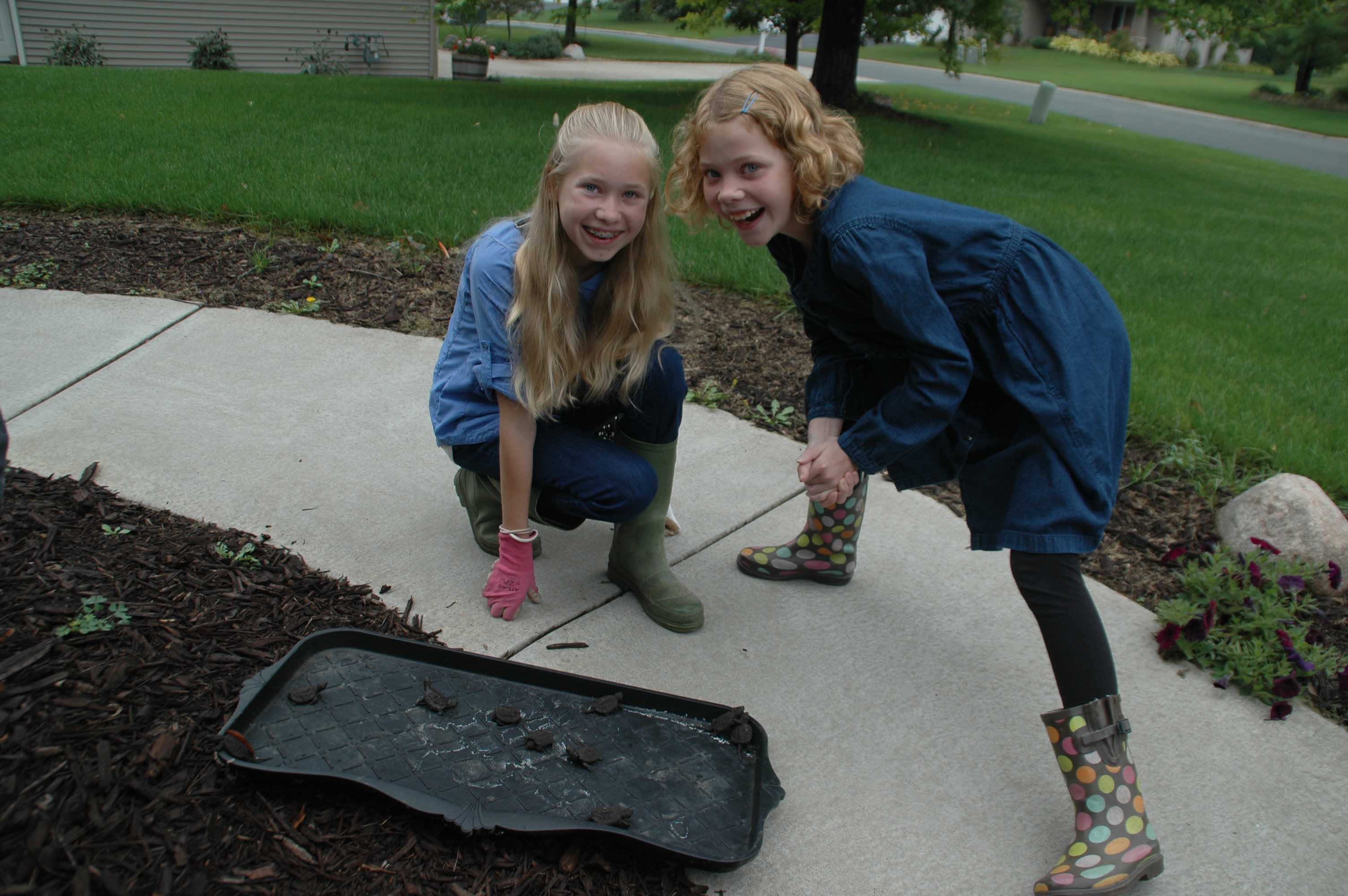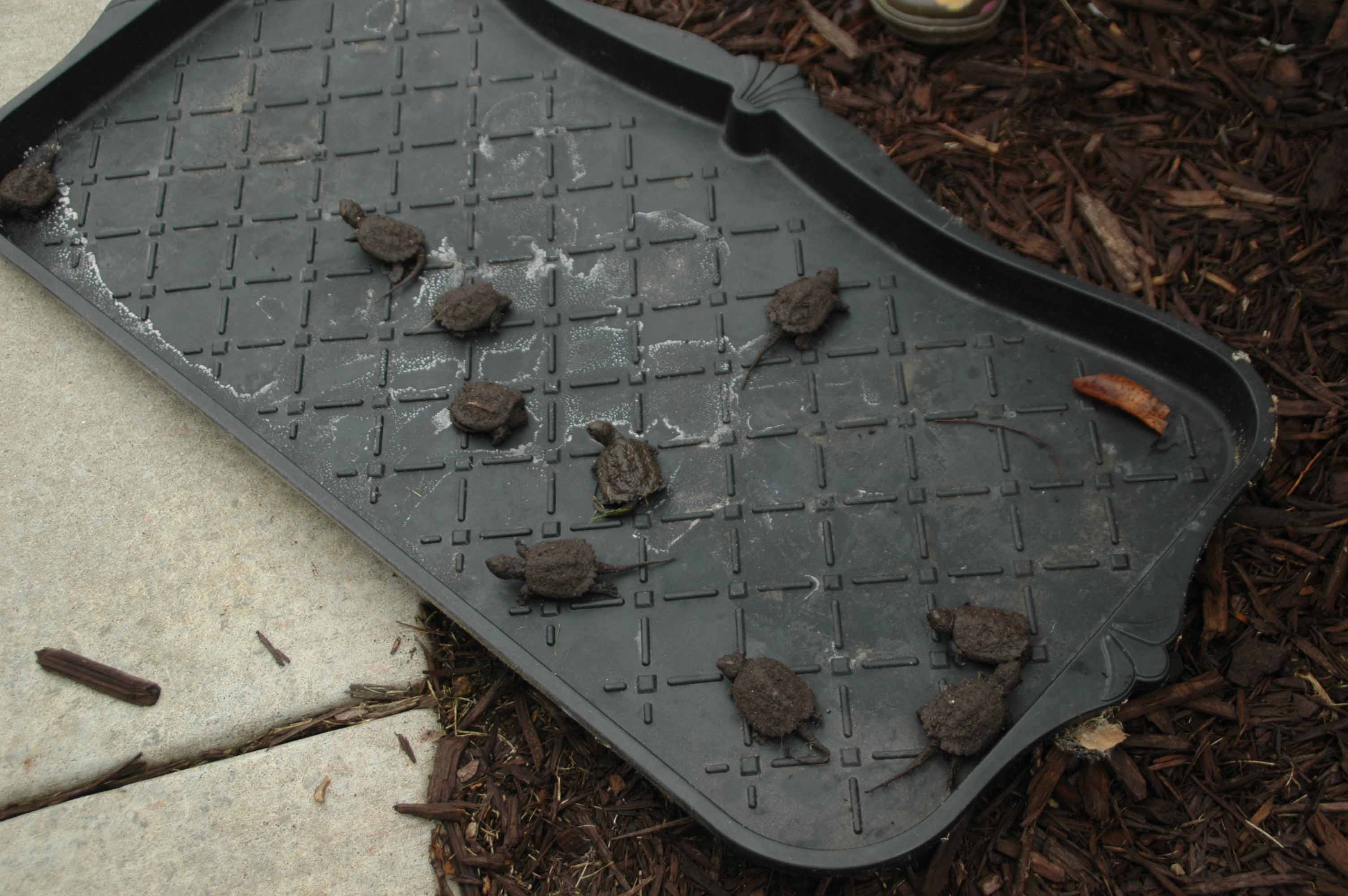 and admiring some of the 18 baby snapping turtles that hatched in our front yard flower bed.
