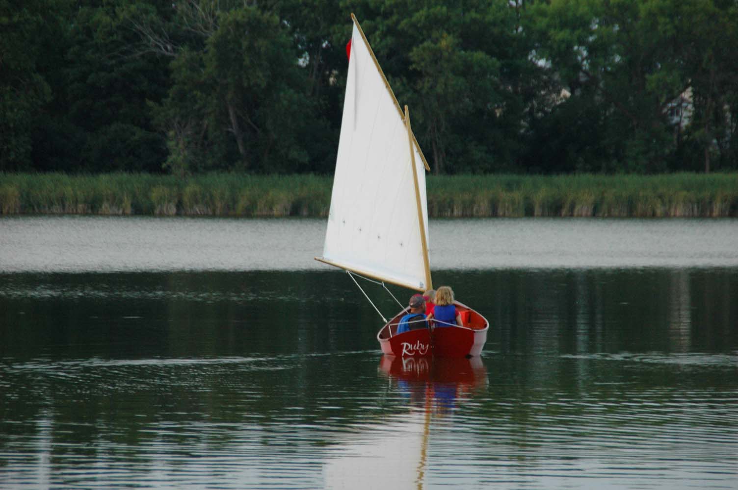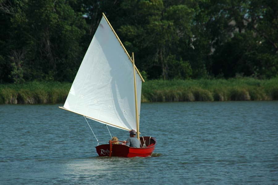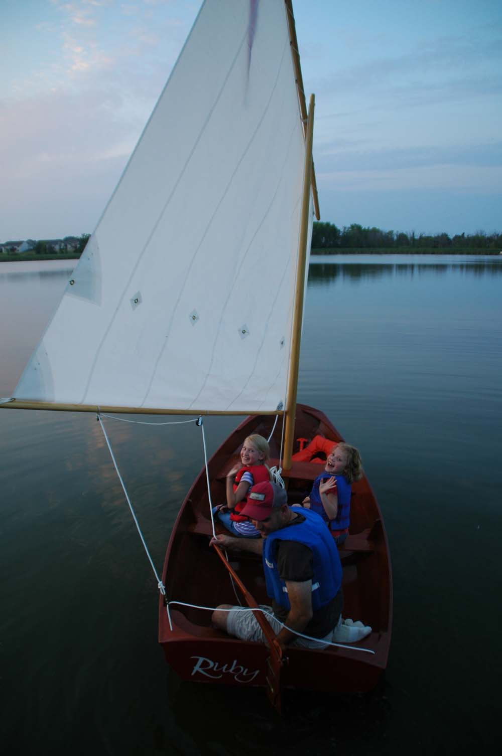 To Michael’s many years of daydreaming, he and our two daughters added a lot of hard work. They learned about team work and compromise, tools and boat parts, woodworking techniques, sewing, physics and sailing. Some parts of the project were indeed dull and tiresome, but the girls caught on to their daddy’s passion and shared his dream of someday sailing that little red boat across the lake. That dream motivated them to keep at it, and in the end, their perseverance helped build more than a boat and more than many summers of father-daughter memories. It built character.