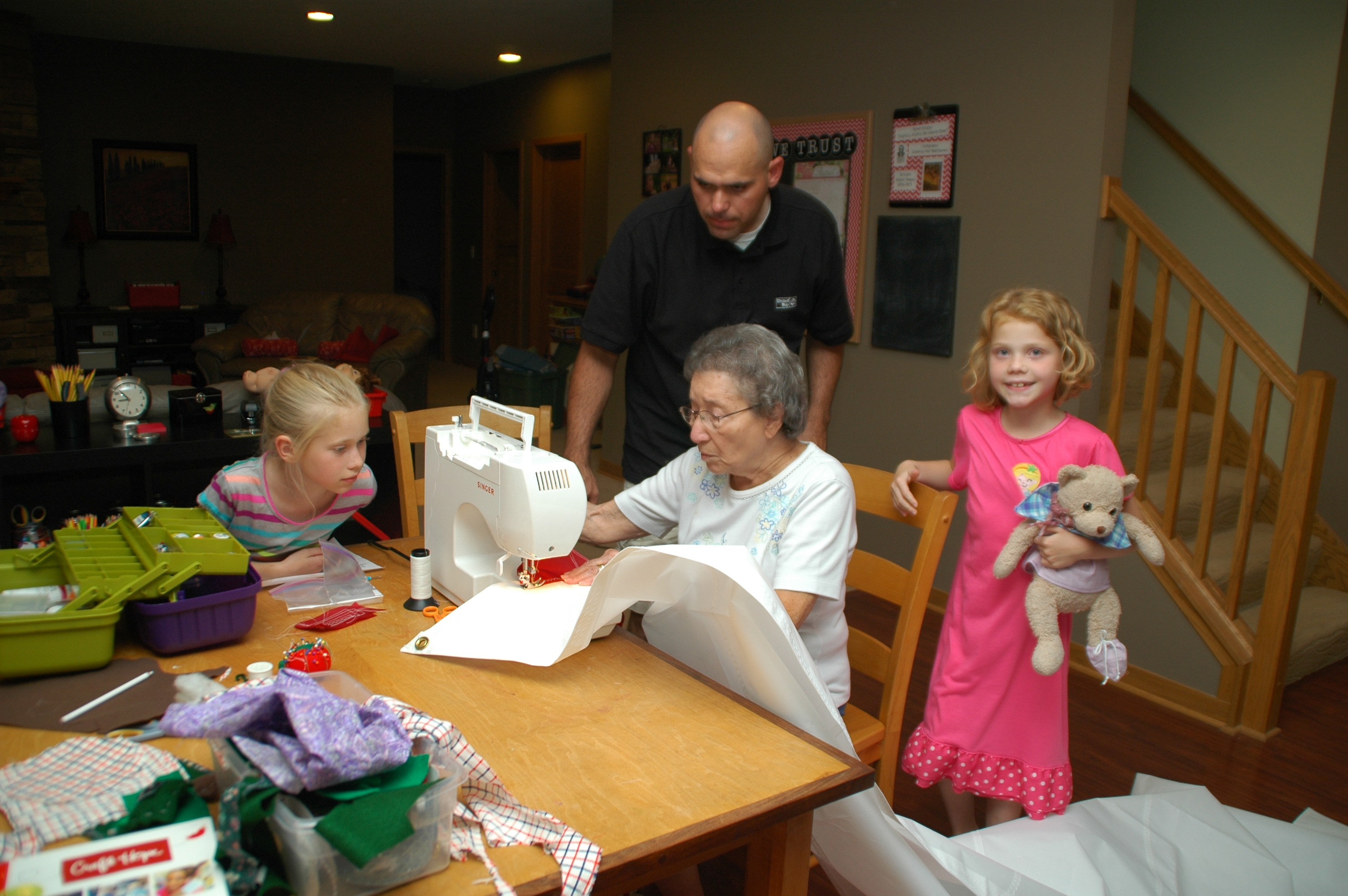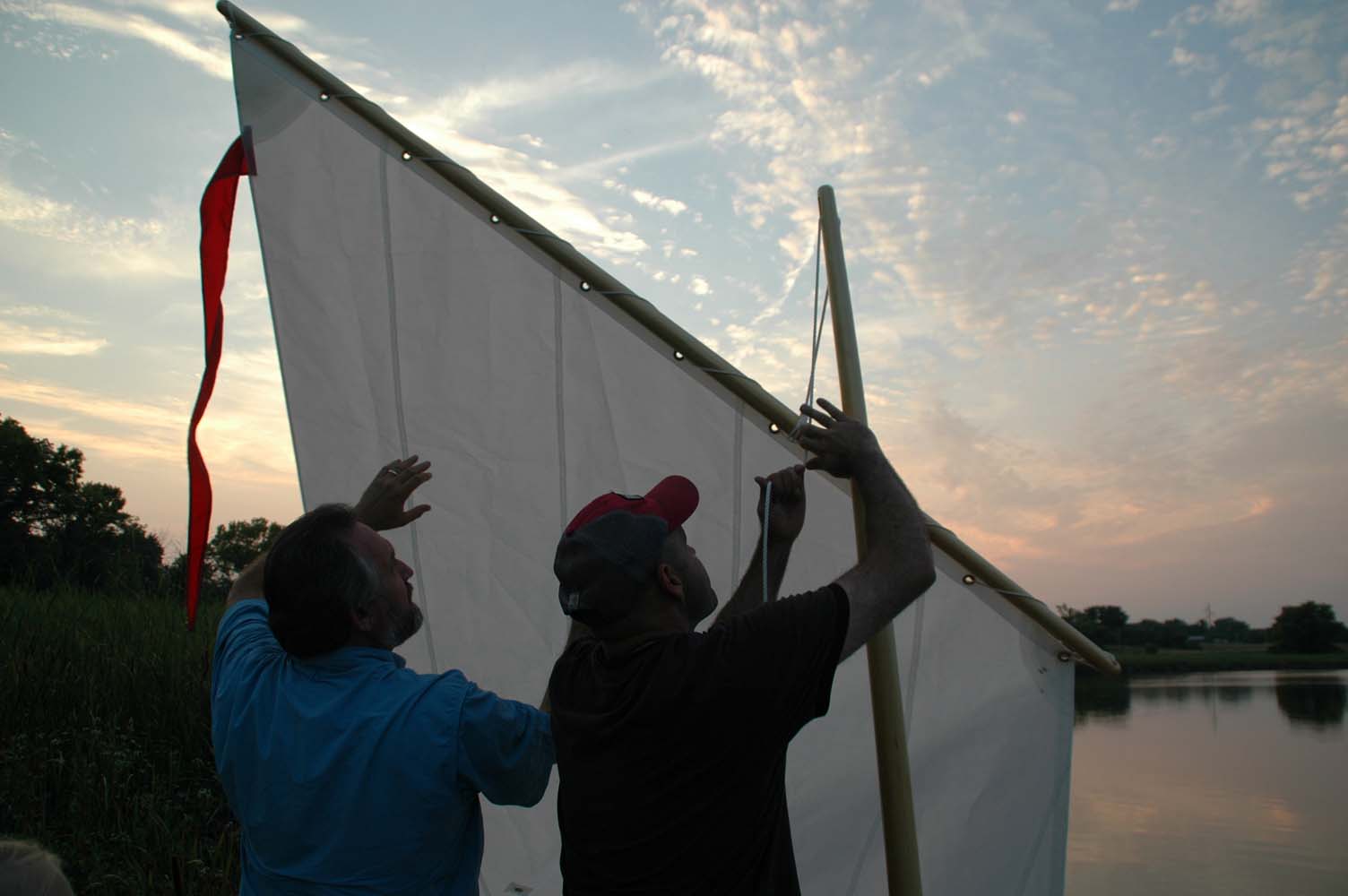 In early August, great-grandma came and helped the girls sew a red streamer flag for the top of the mast.