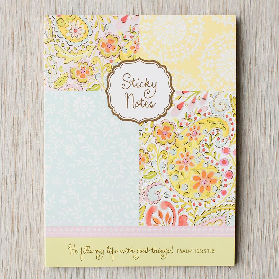 DaySpring sticky notes Am I the only one who loses entire pads of sticky notes amongst the clutter on desks or countertops? These are such pretty sticky notes, and because they are held together in a nifty 6 by 8-inch folio, they are much easier to find.