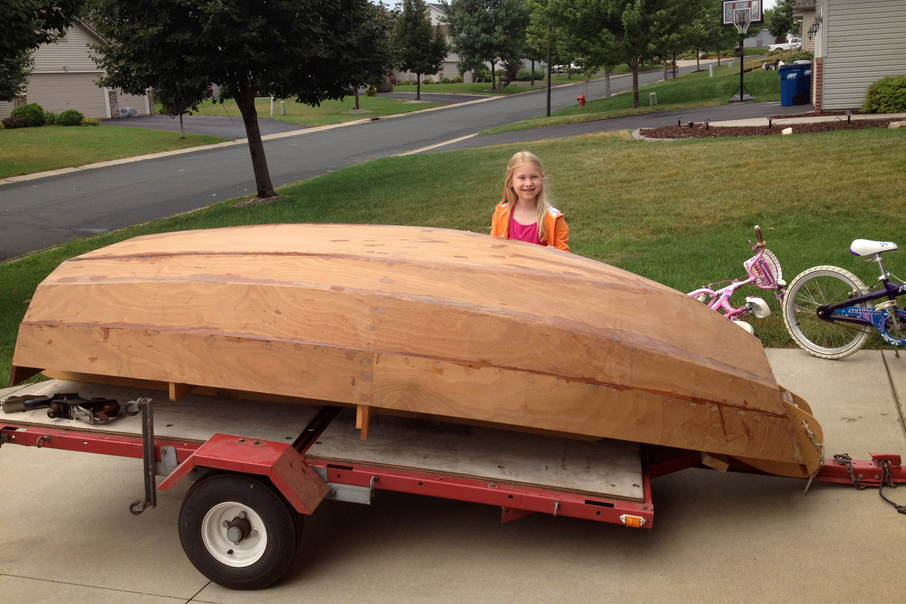 When summer arrived, we took a 1,500 mile road trip to haul Ruby’s hull and the rest of the kit home to Minnesota. At first glance, the overturned hull wasn’t much to see, and the girls’ excitement seemed to wane a bit until the strongback was removed and they could imagine the little boat it might become.