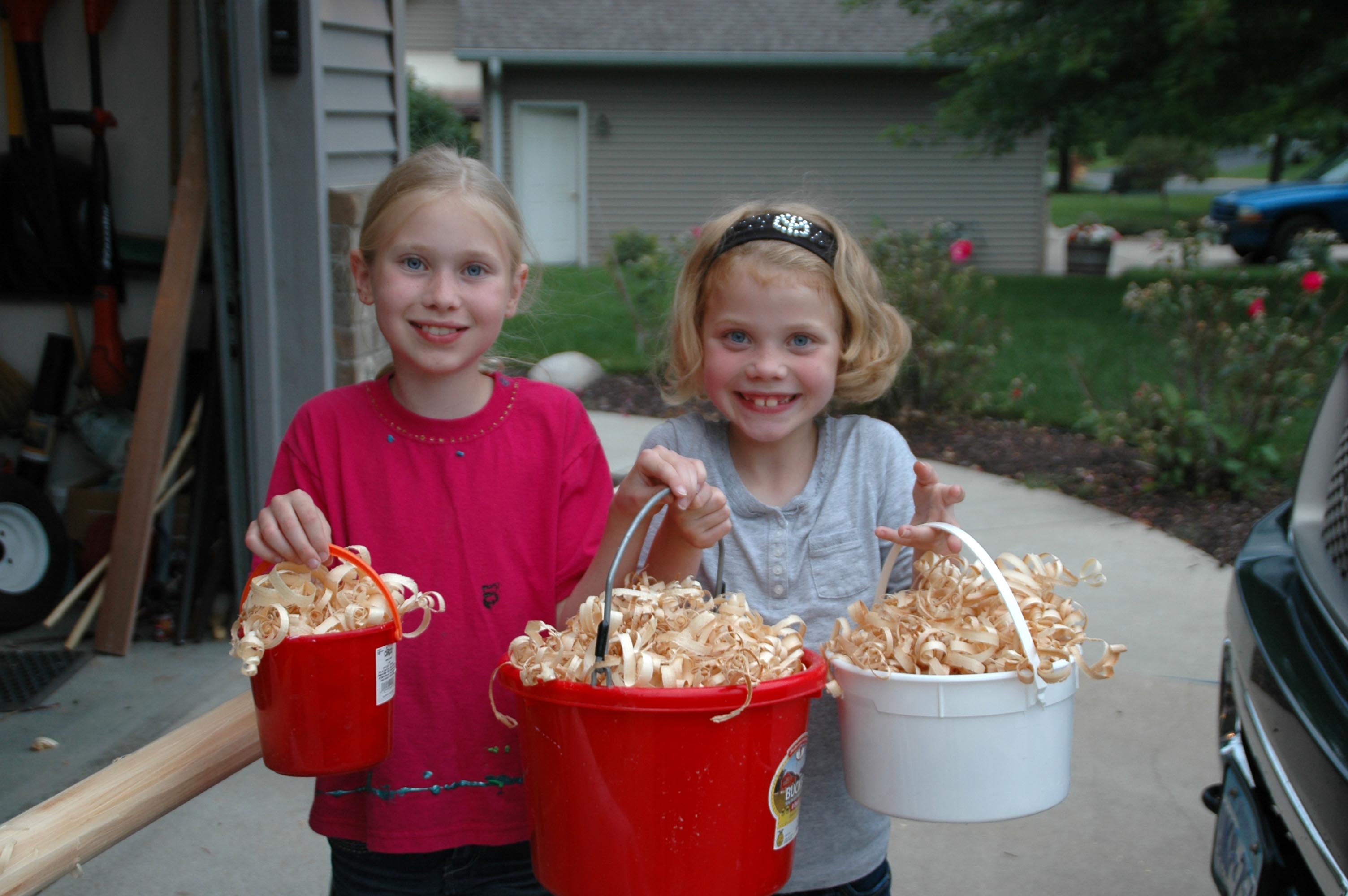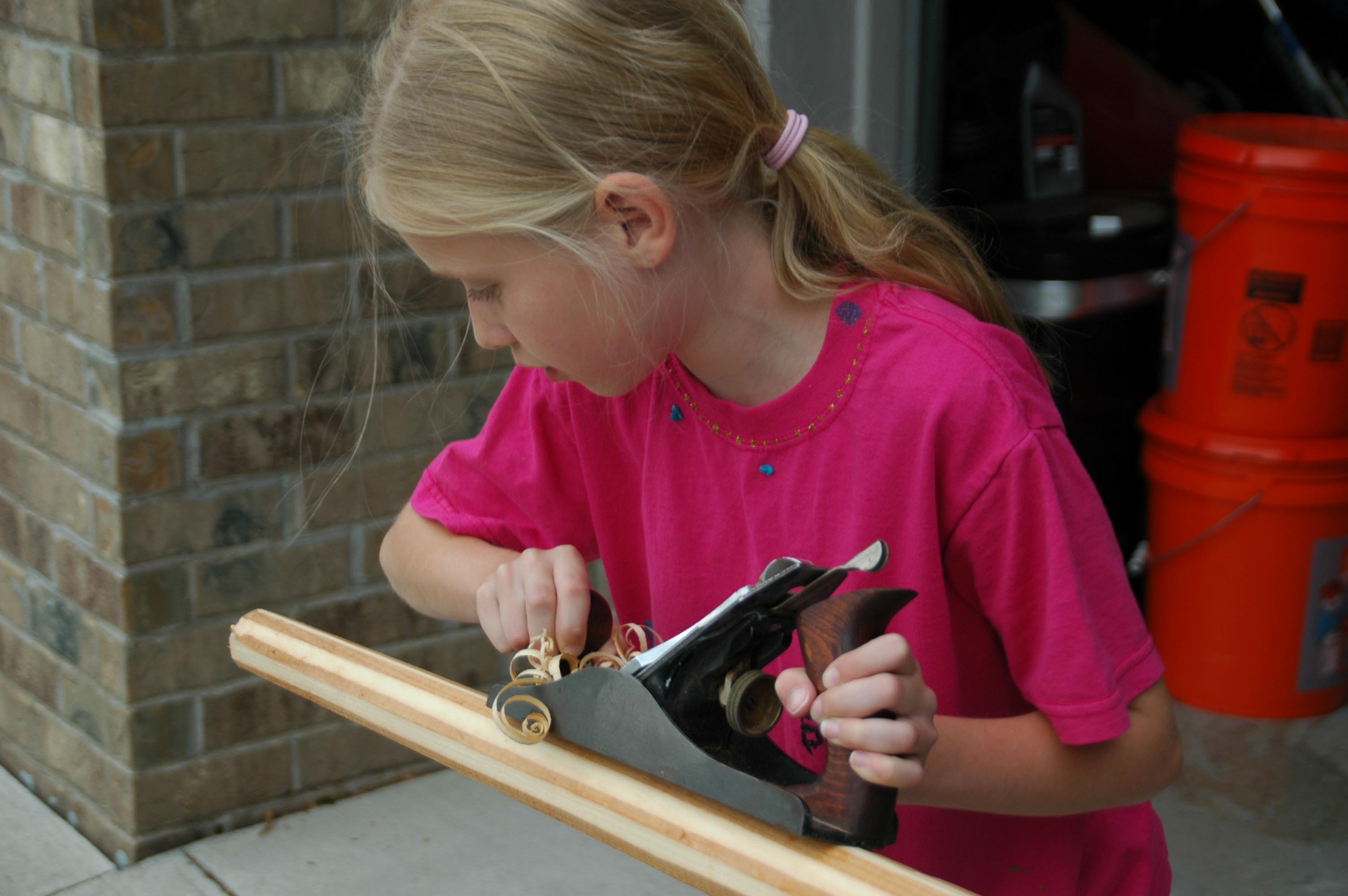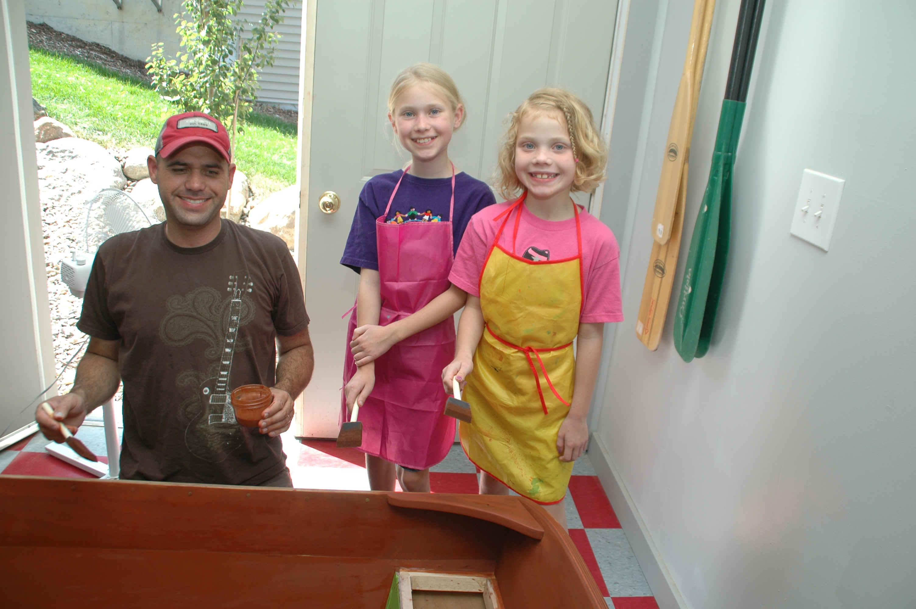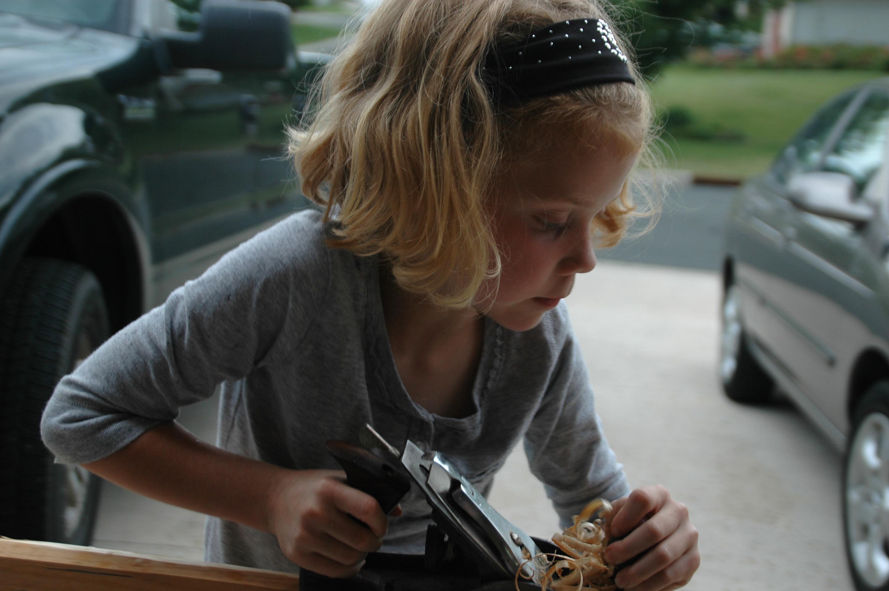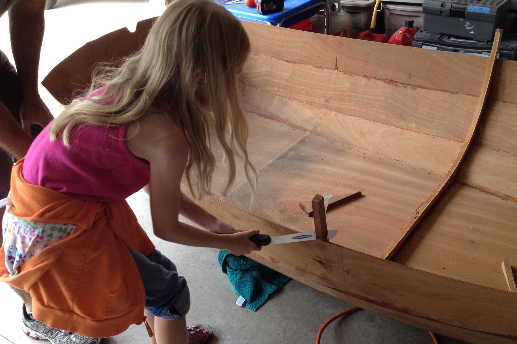 Soon curls of wood shavings, piles of sawdust and woodworking tools littered the garage as Michael and his little crew set to work reassembling the damaged hull and building seats. More than once the girls decorated their daddy’s tool box with curly wood shavings.