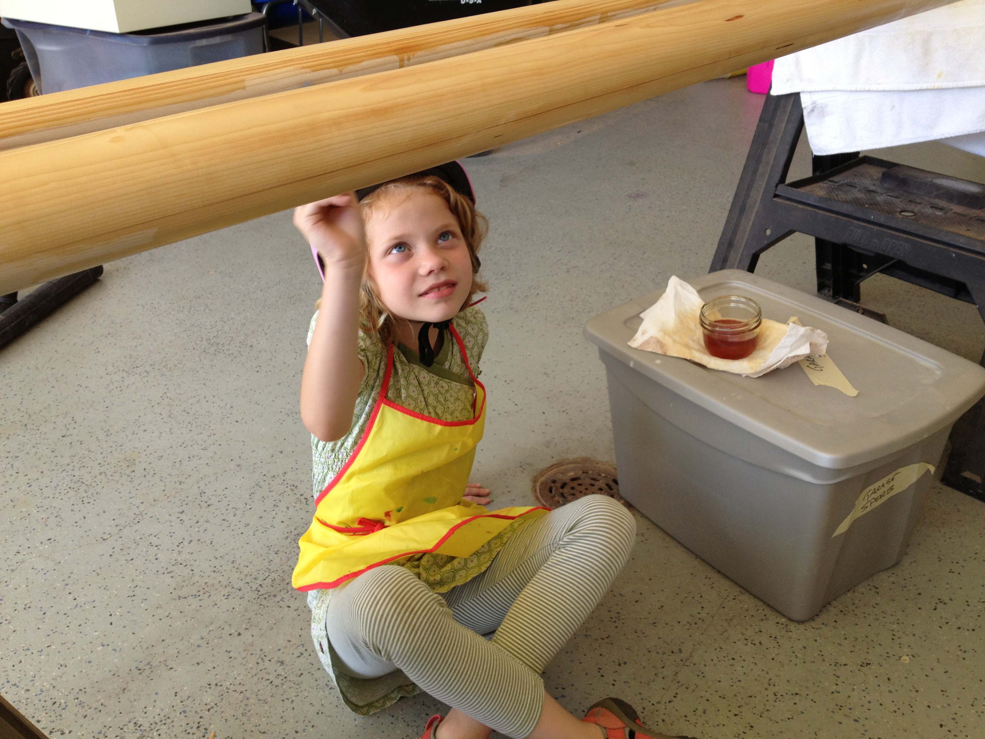 The next summer, the girls were 7 and 10, and they continued to help their daddy with the woodwork and staining, rounding the mast, painting the hull red and attaching the bronze hardware.