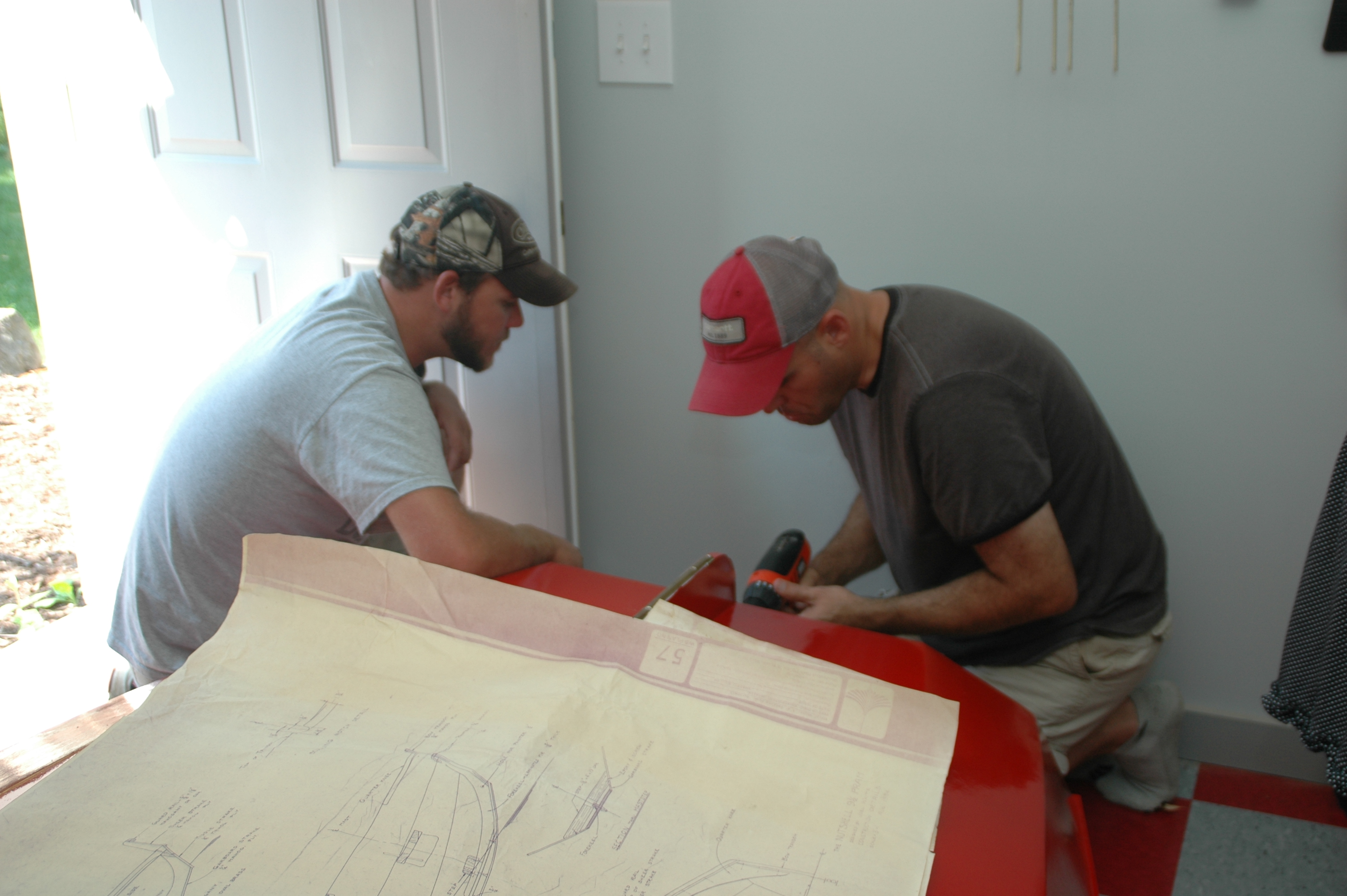 The wooden hull had some water damage, but my father-in-law thought it and the rest of kit were worth redeeming for us. So into the dumpster Papa Larry climbed on a hot Arkansas summer day, pulling out the hull, blueprints, bronze hardware, rope, wood for the mast and spars, and a VHS instructional tape. Later we learned that the neighbor had started the project with his father, who had recently passed away. That loss paired with the flood damage made him abandon any hope of finishing the boat.