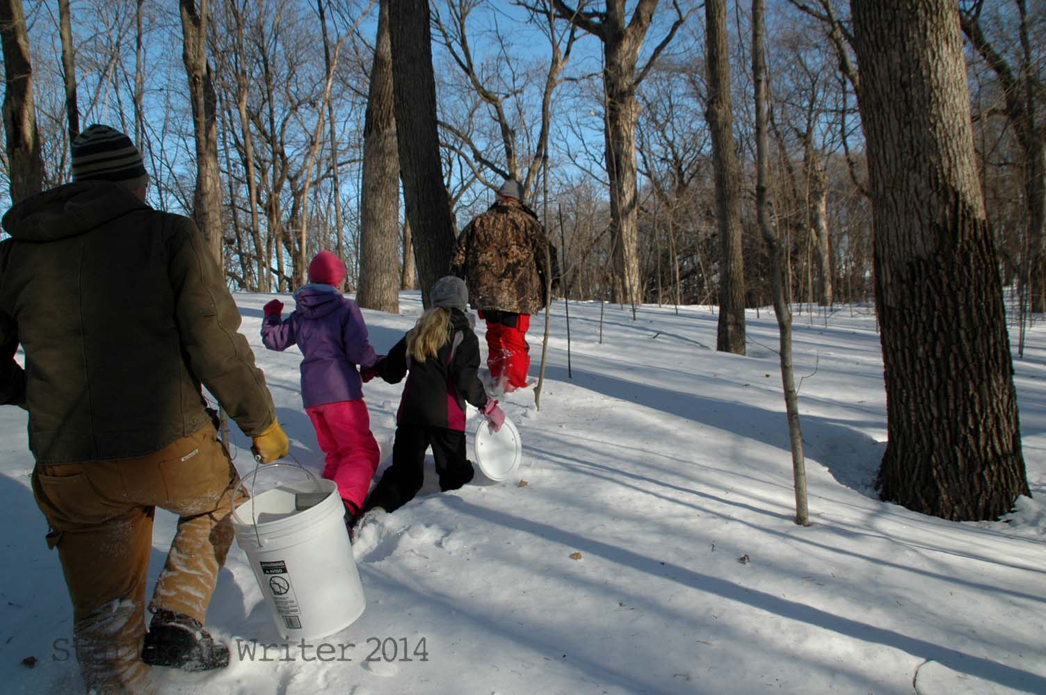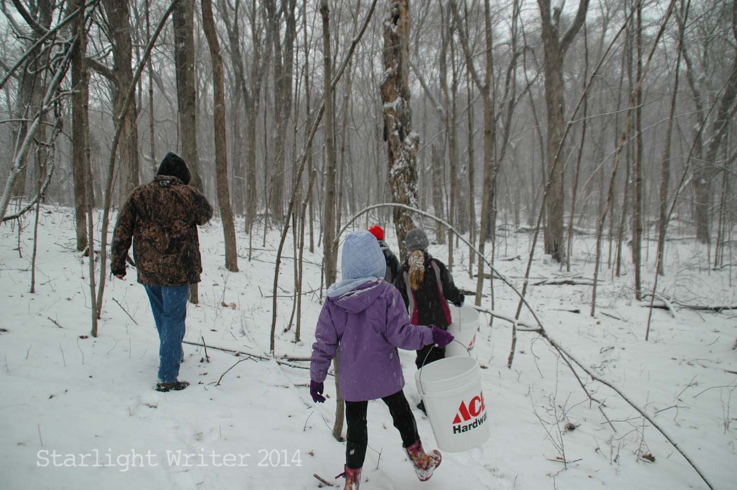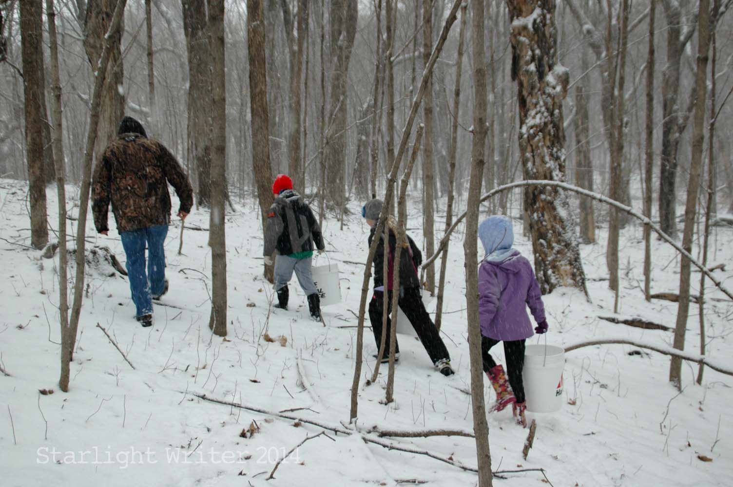 The crew of kids, they all hear him say “sugar” and quickly grab buckets. They follow him closely into the woods.