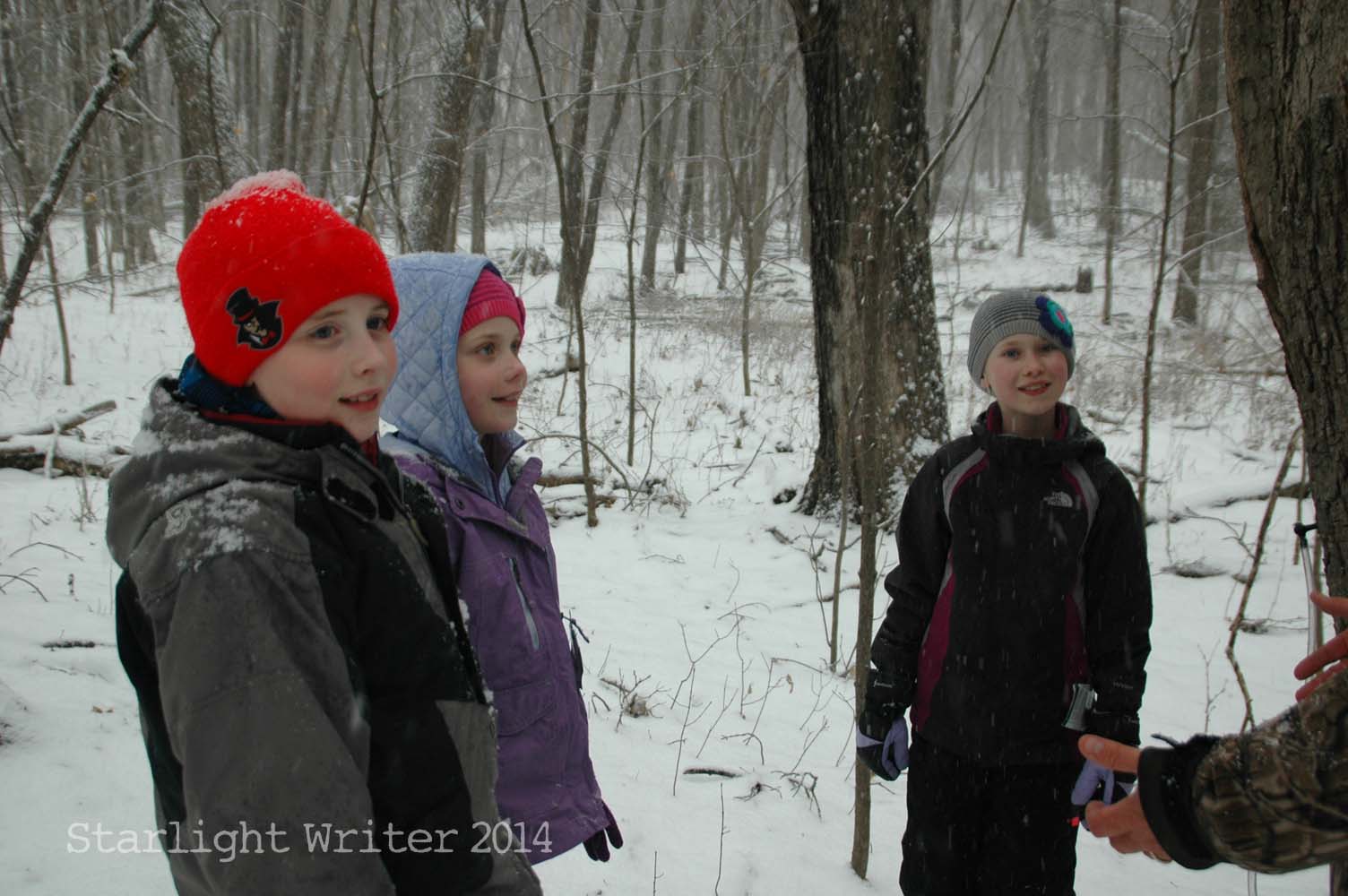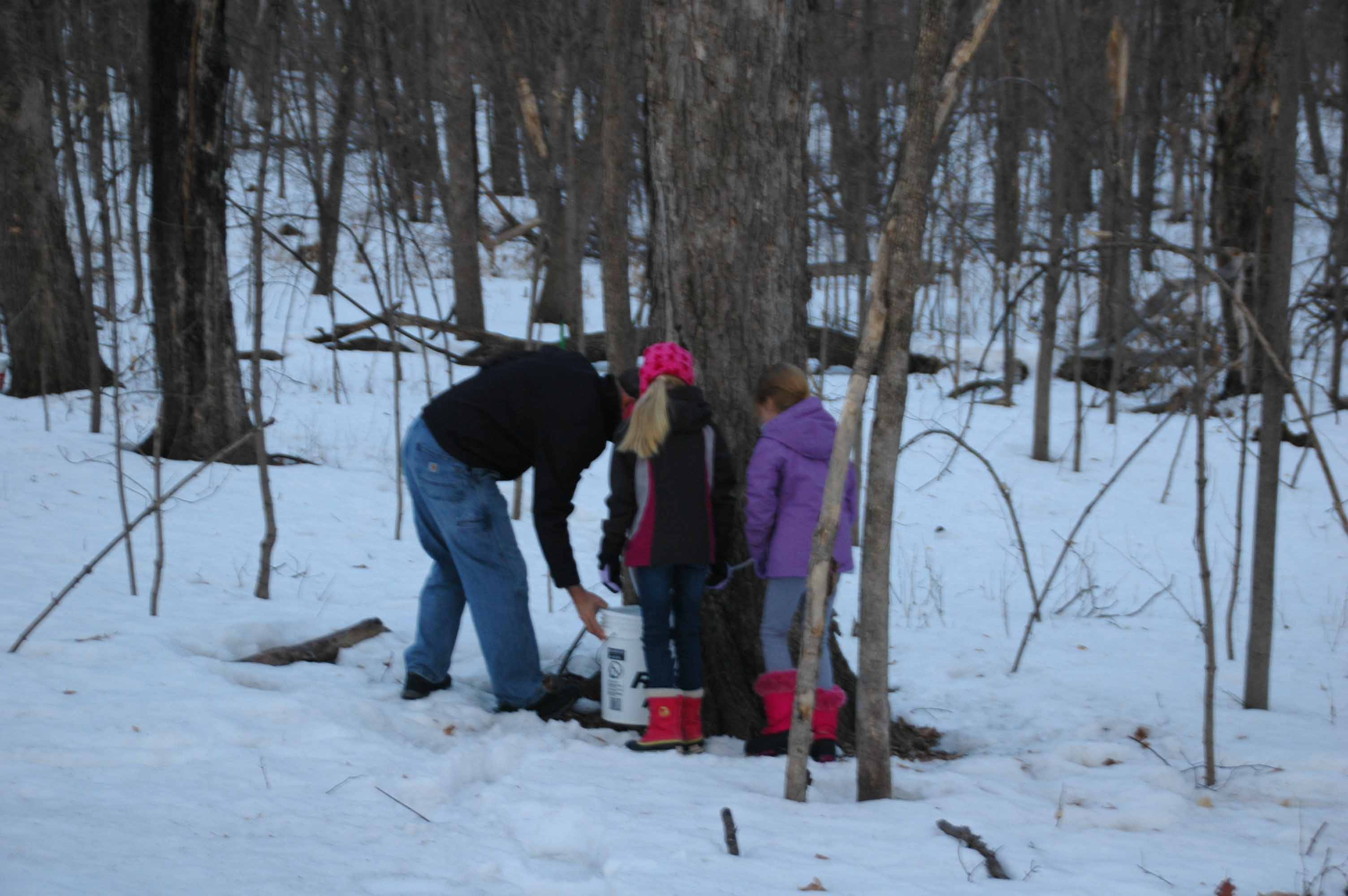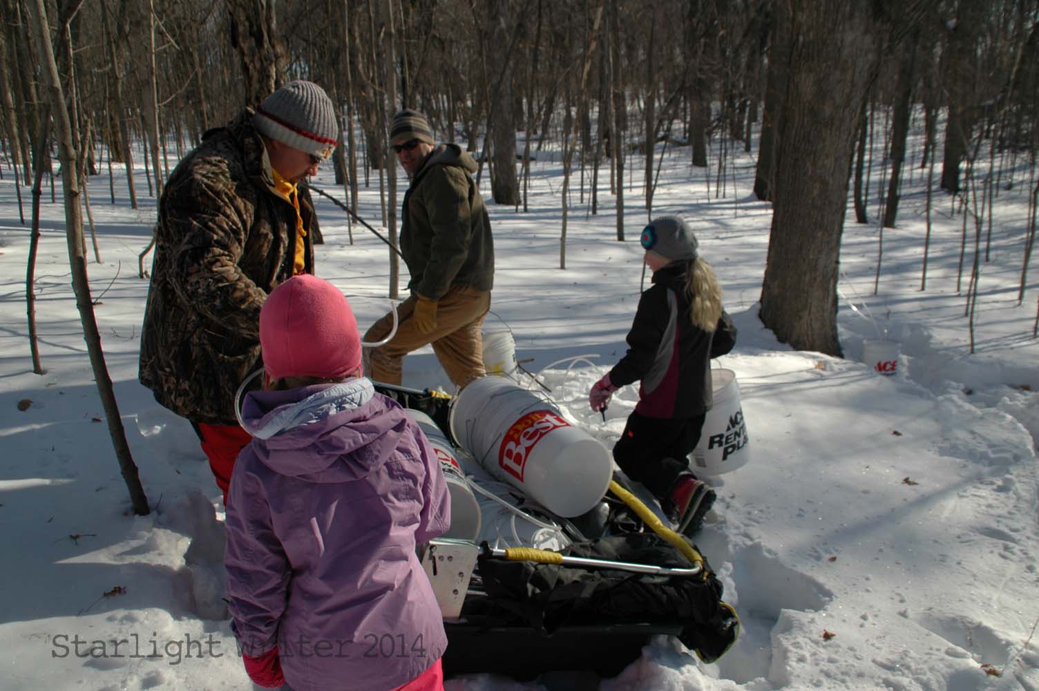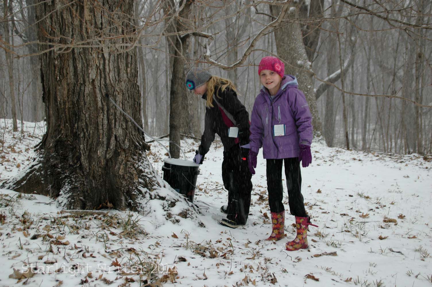 The crew of kids, they all hear him say “sugar” and quickly grab buckets. They follow him closely into the woods.