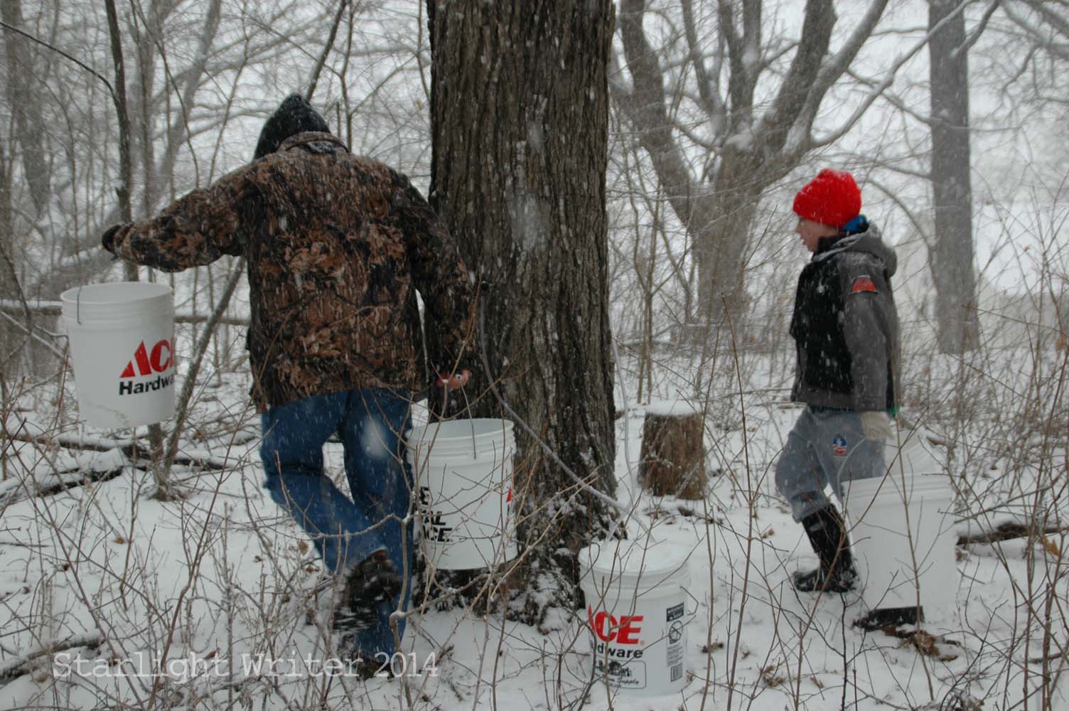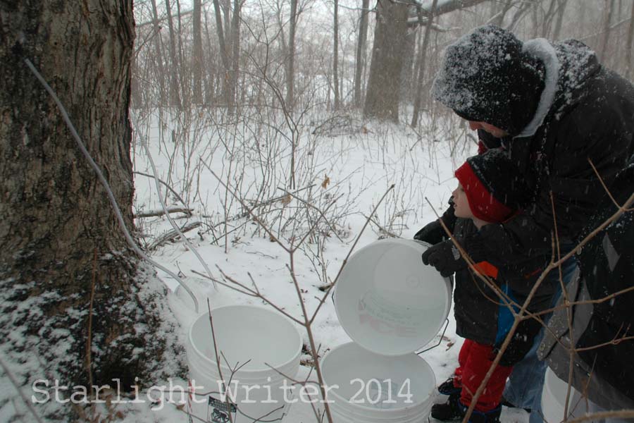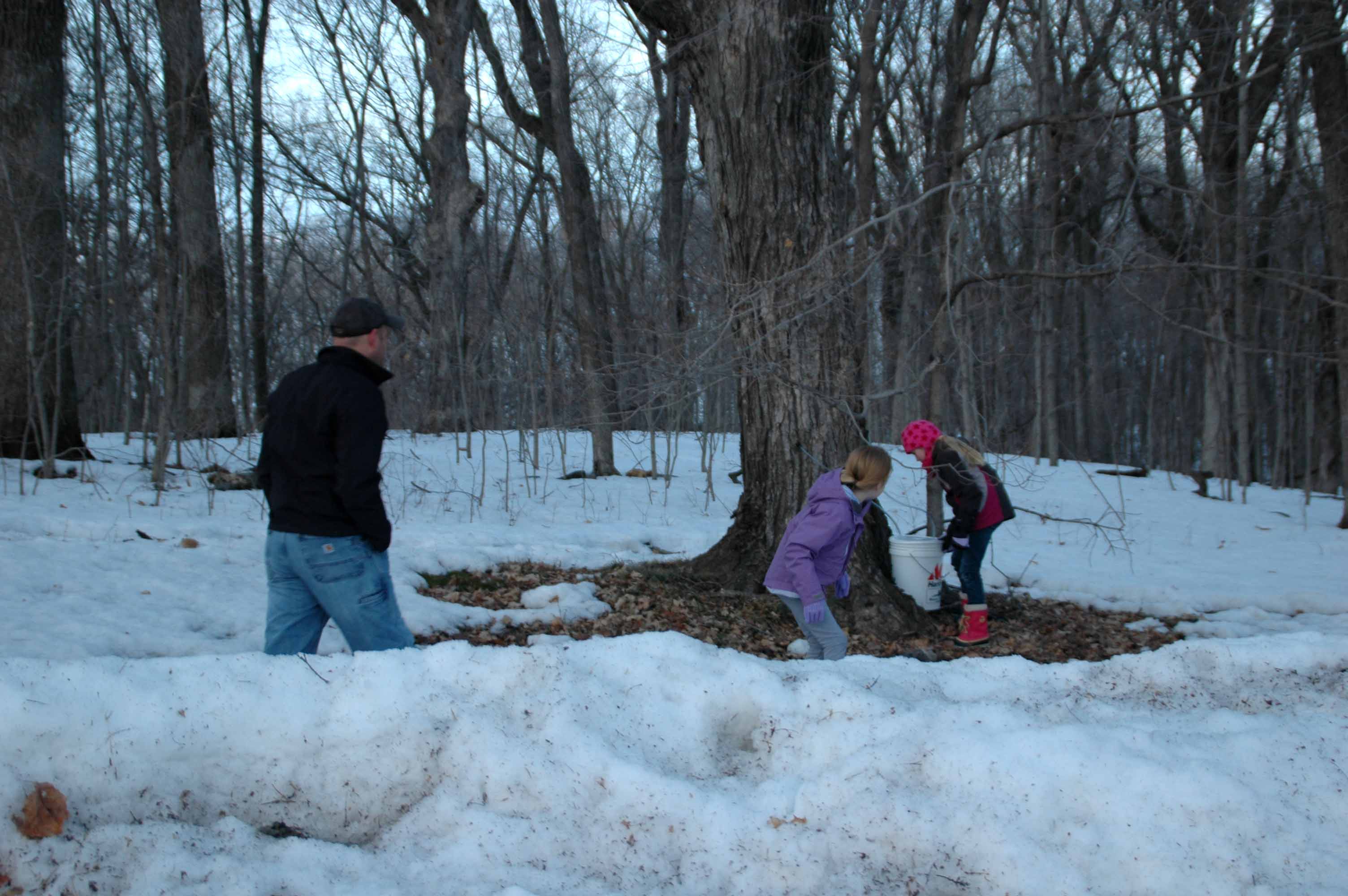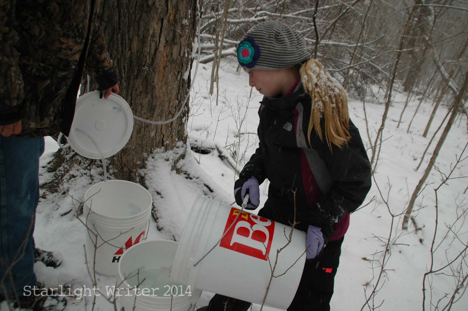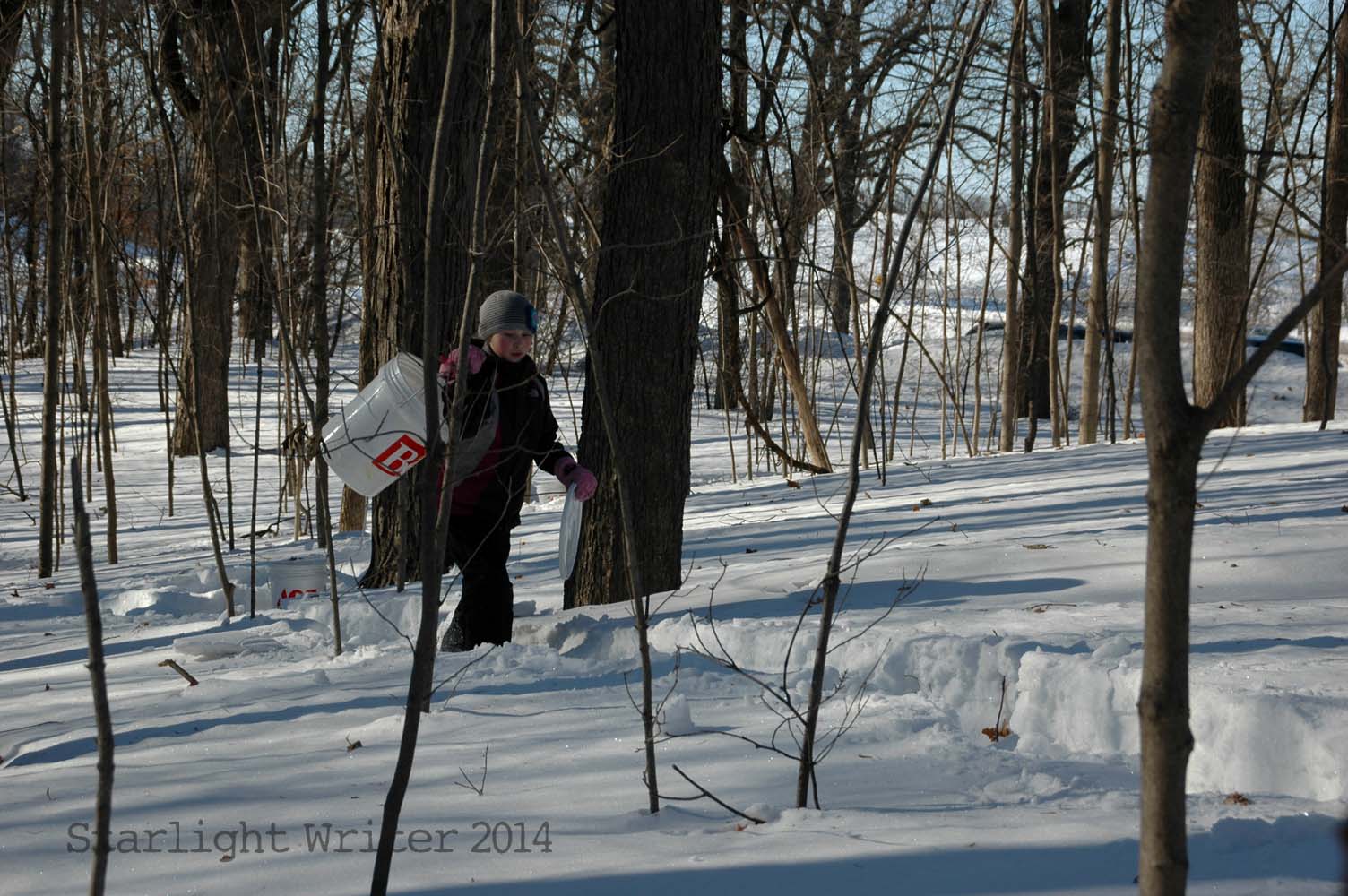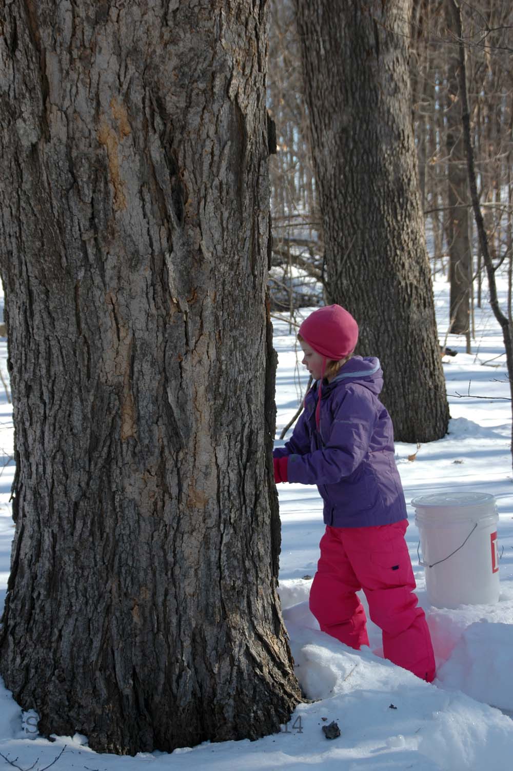 My oldest, she runs on to another tapped tree and excitedly reports that the bucket there is really, really heavy. Heavy with sap!