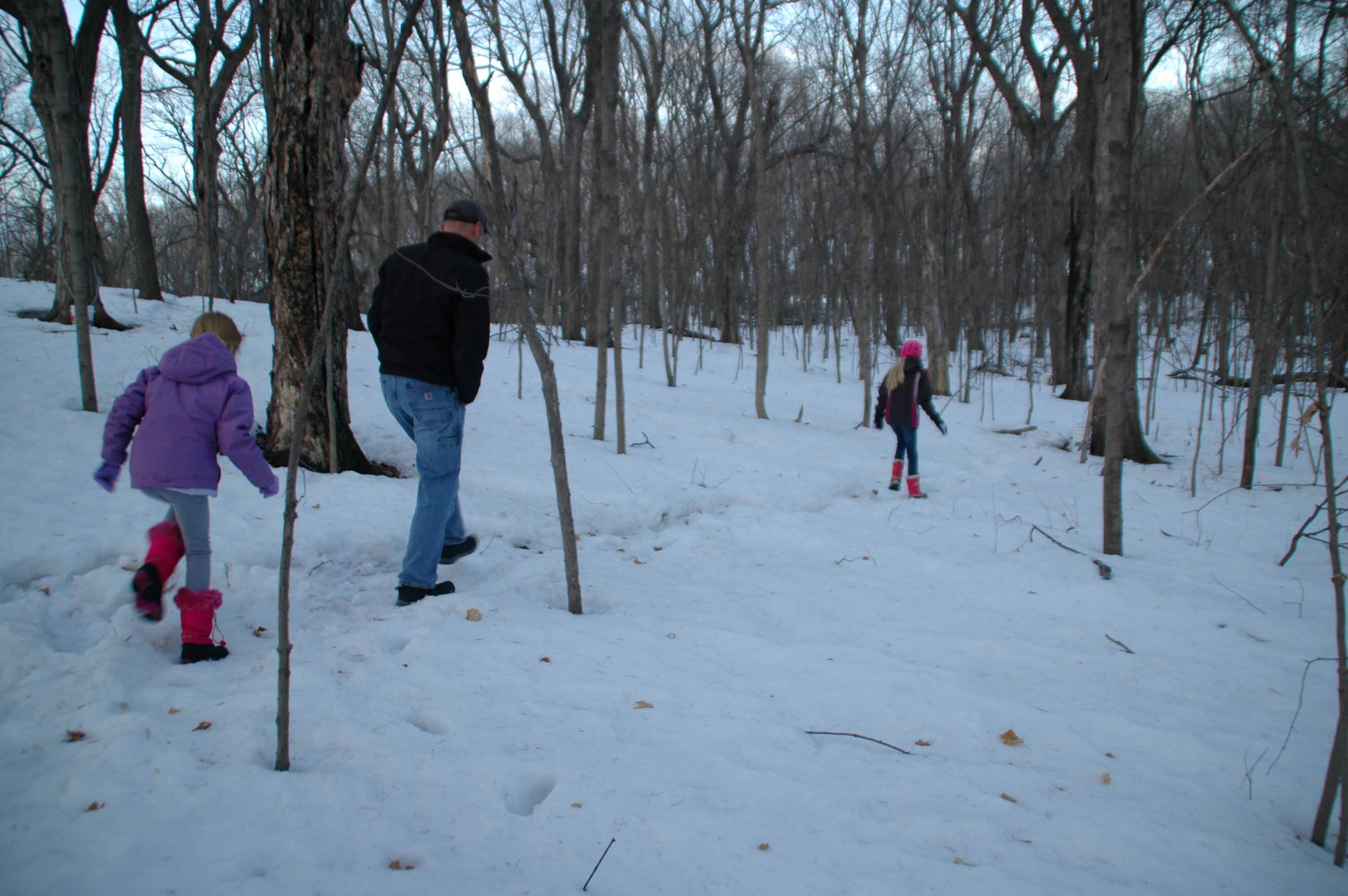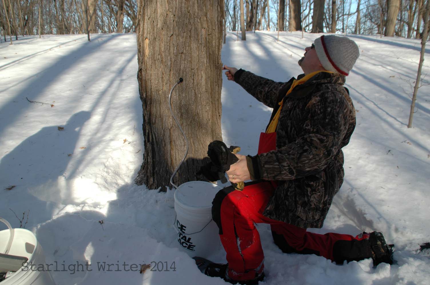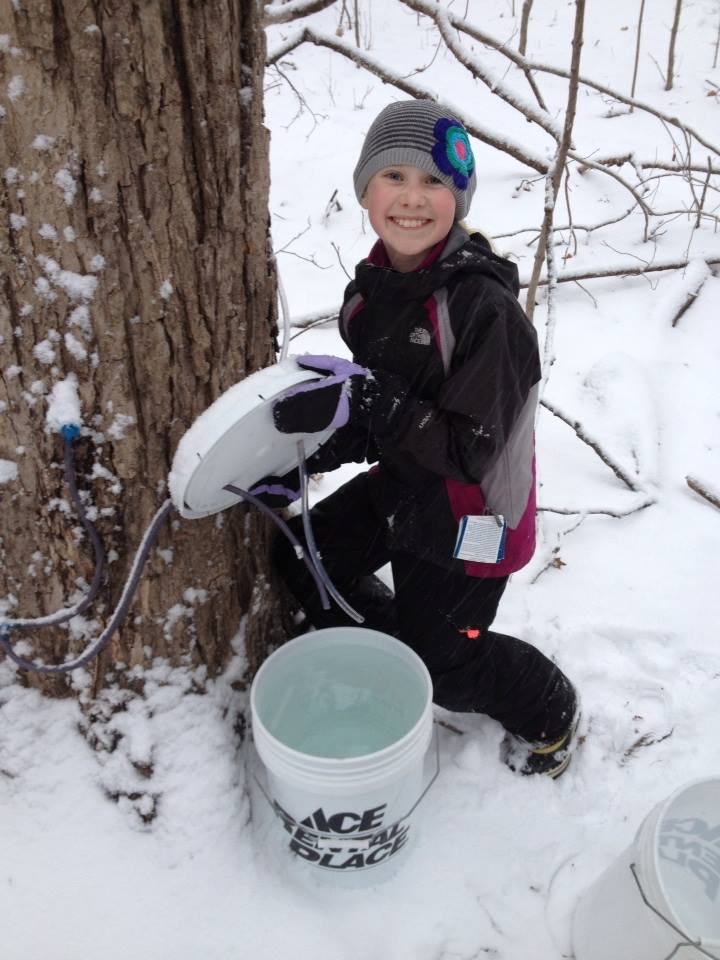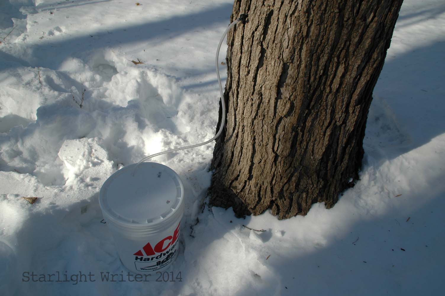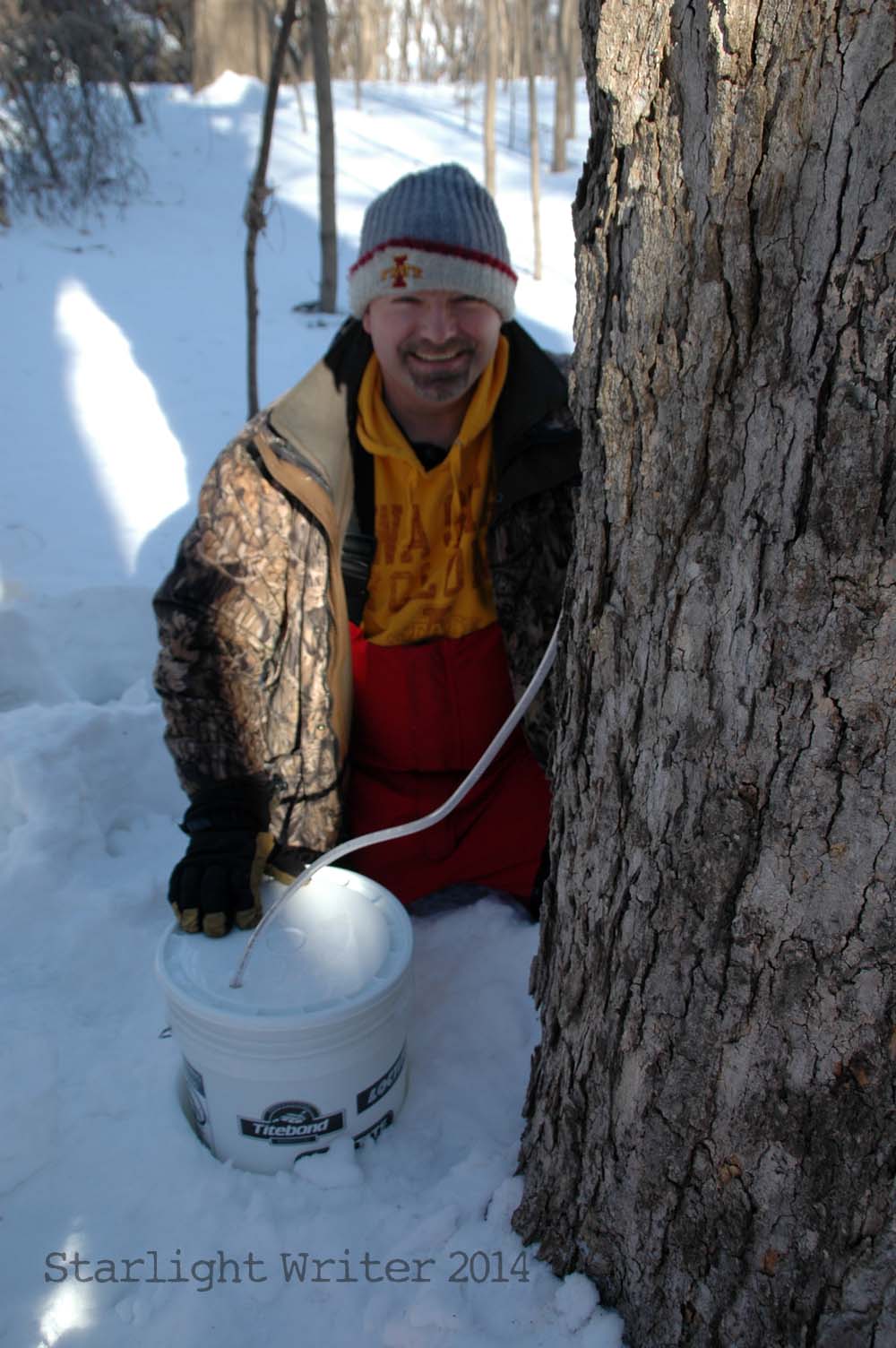 My oldest, she runs on to another tapped tree and excitedly reports that the bucket there is really, really heavy. Heavy with sap!