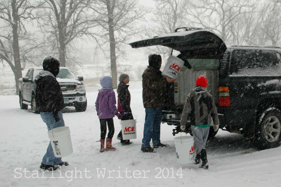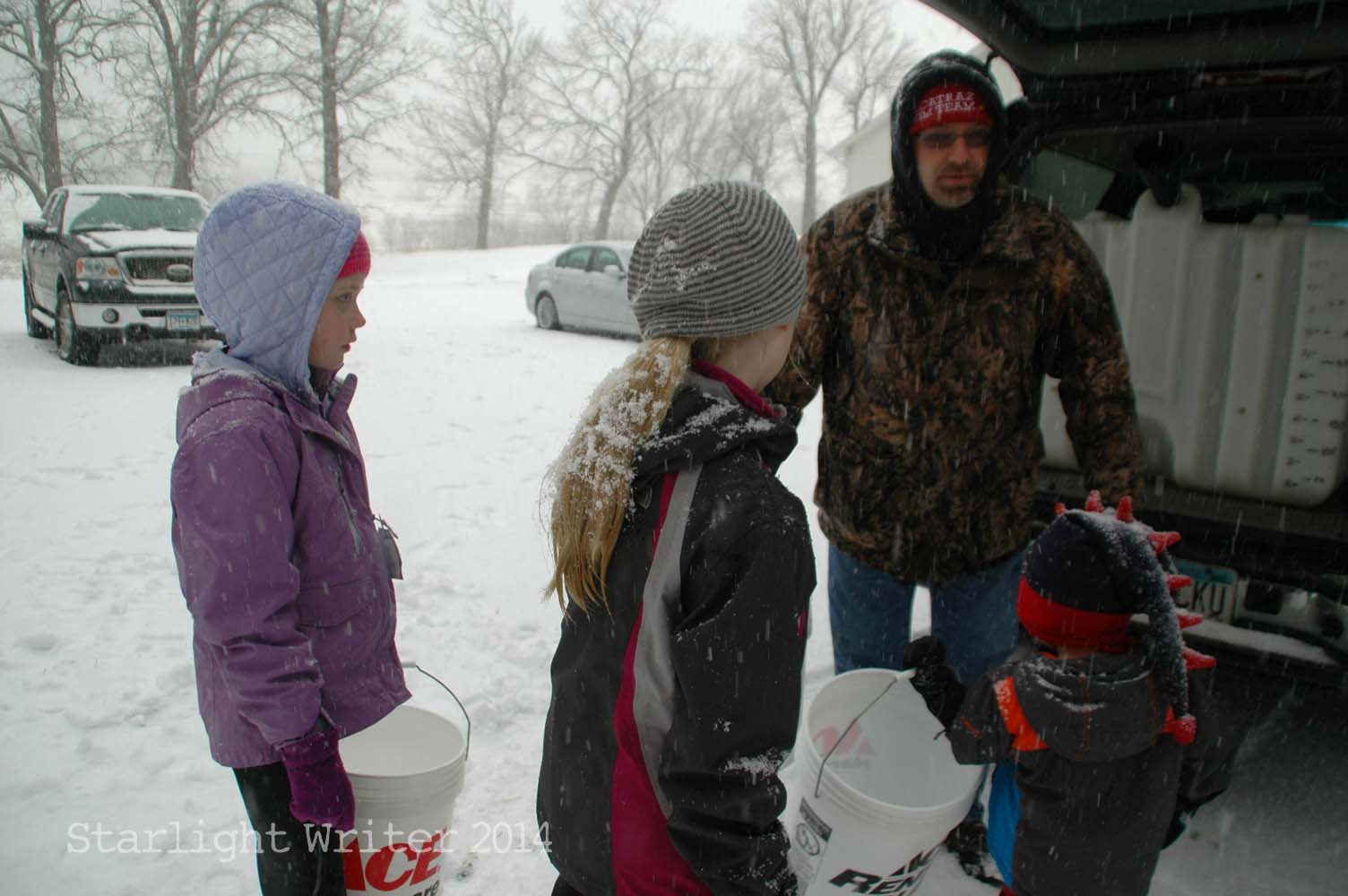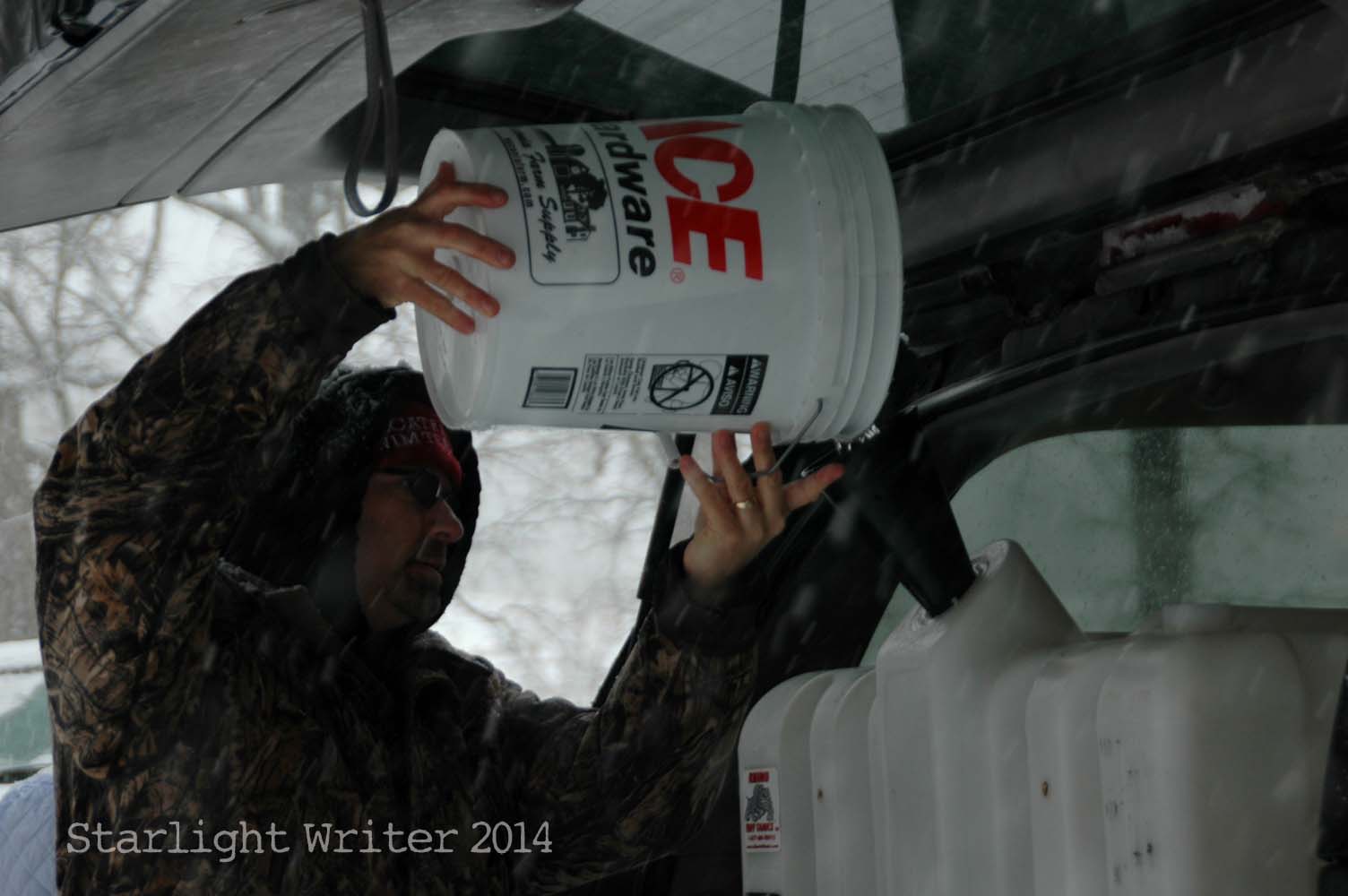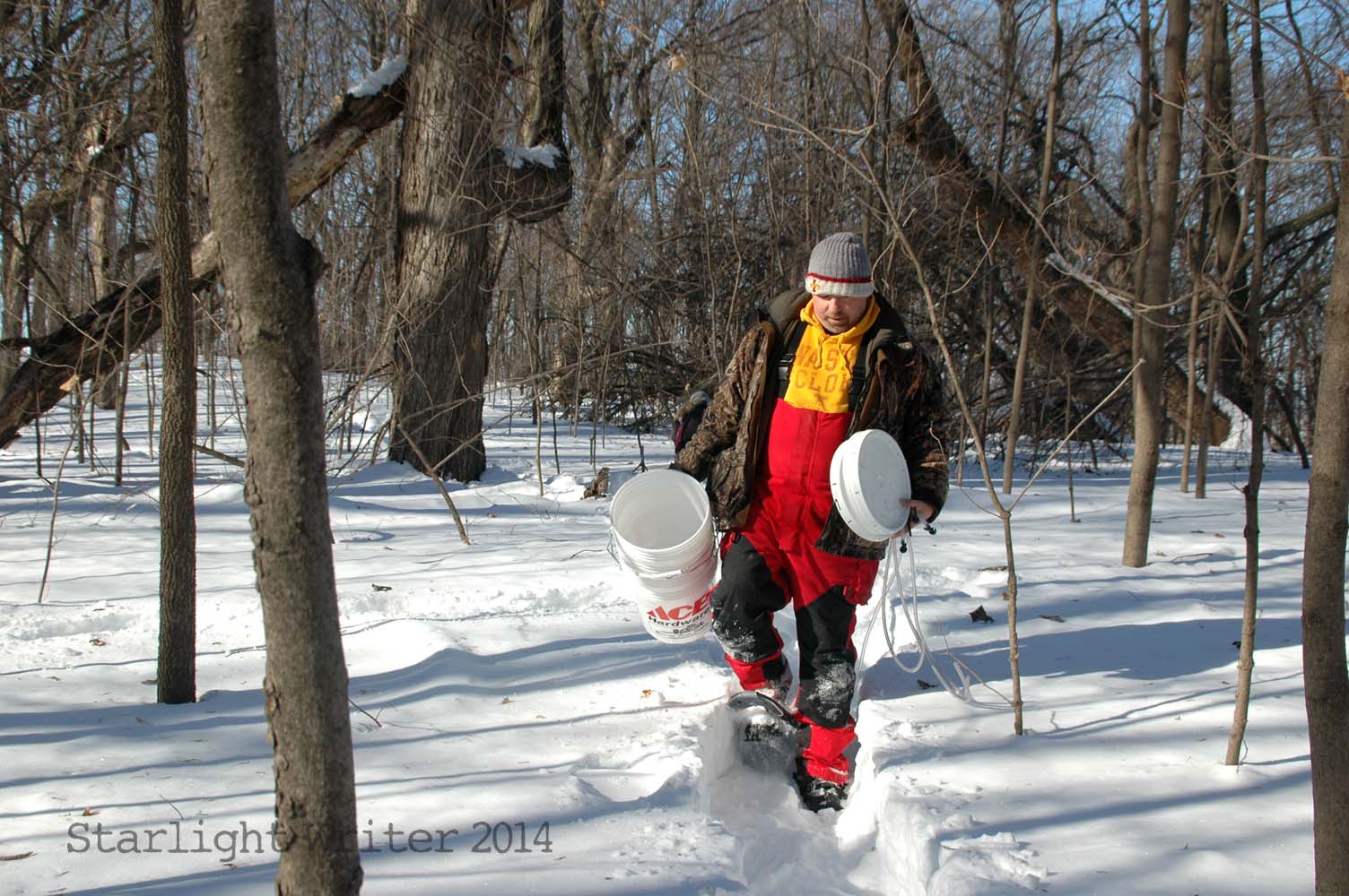 With full buckets in tow, we hike back through the snowy woods to the parking lot, where Mr. Masters pours all of the sap into a huge tank in the back of his suburban.