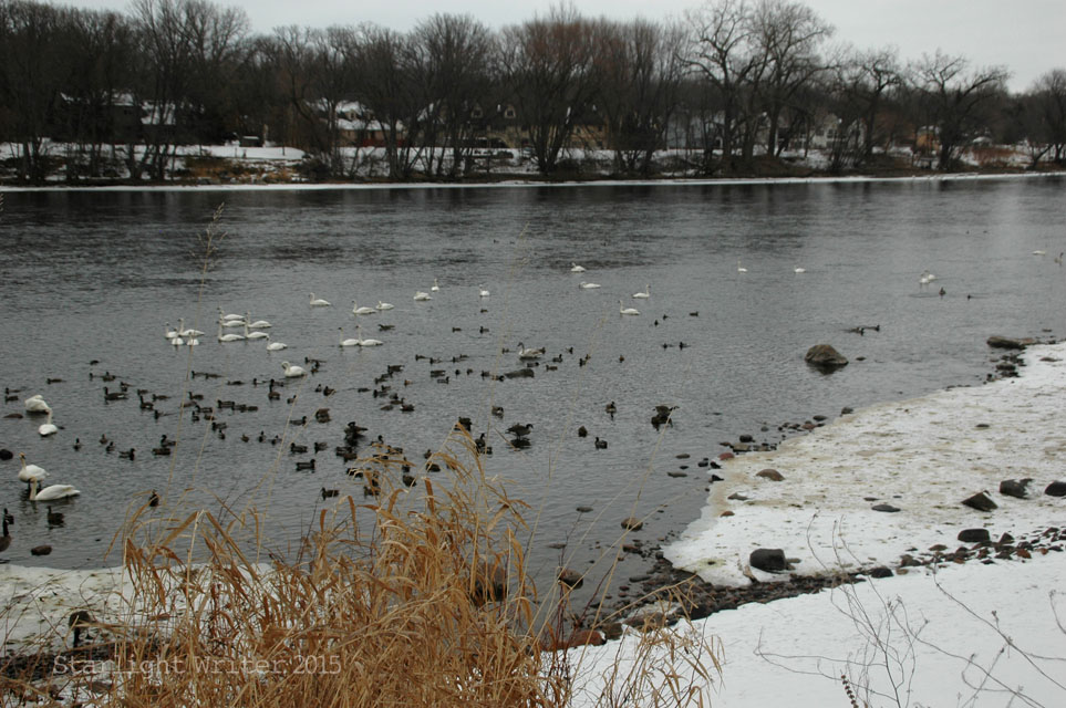 Trumpeter swans! Hundreds, sometimes even a thousand, wintering trumpeter swans gather on this rare spot of open water on the Mississippi River when the marshes and ponds in Minnesota are frozen. While the river does freeze over, this particular spot in Monticello rarely freezes because of the power plant upstream.